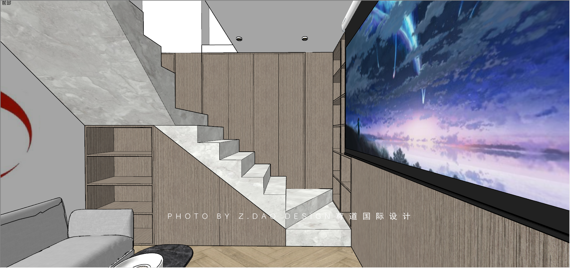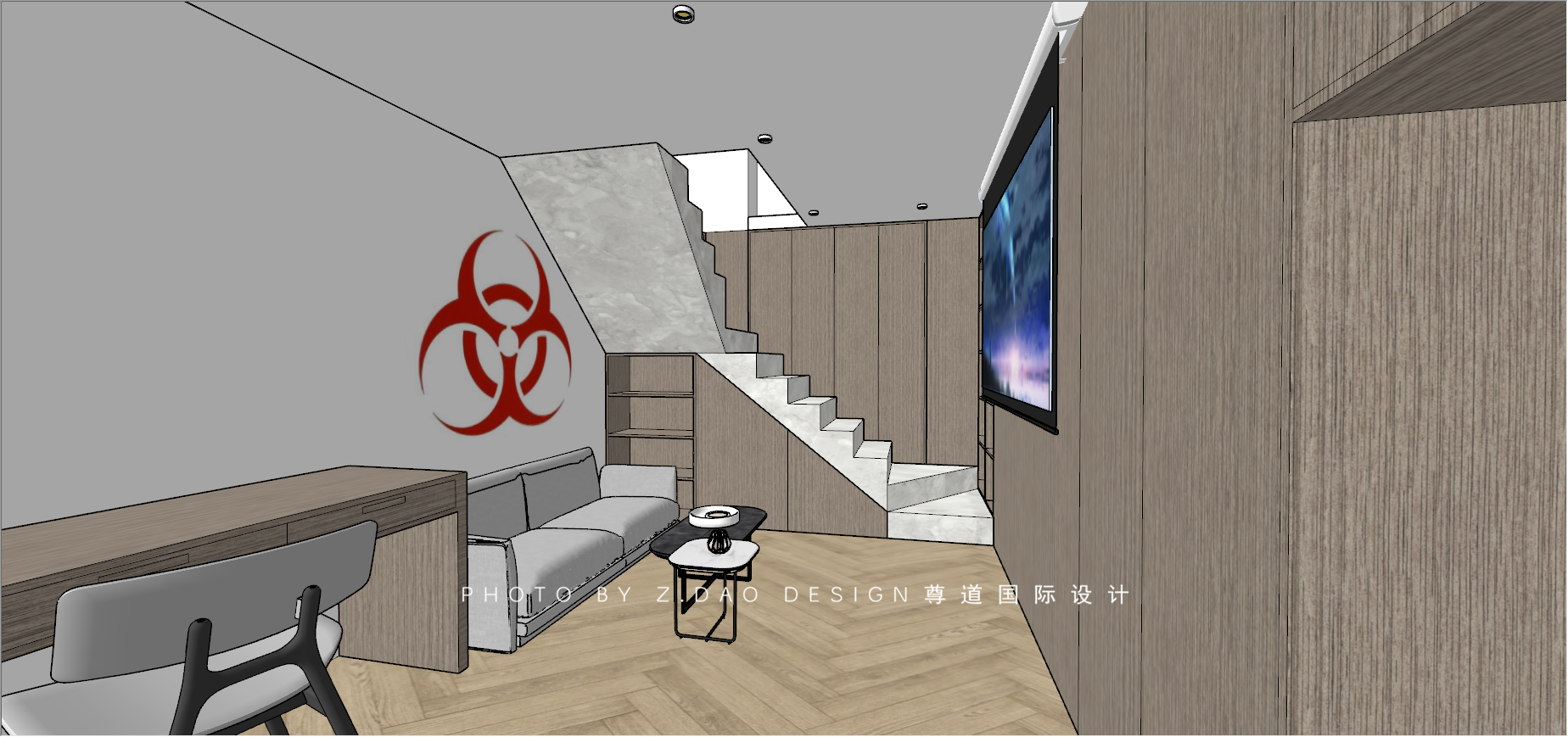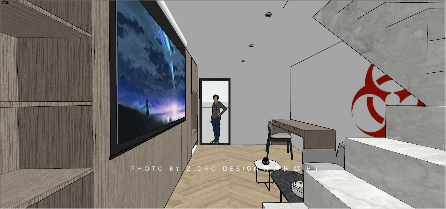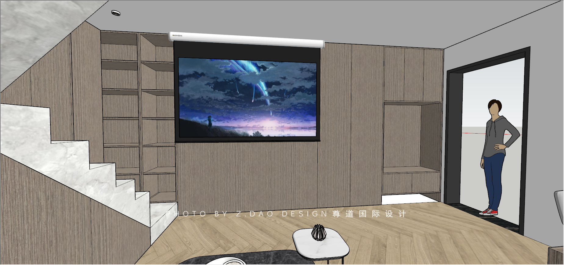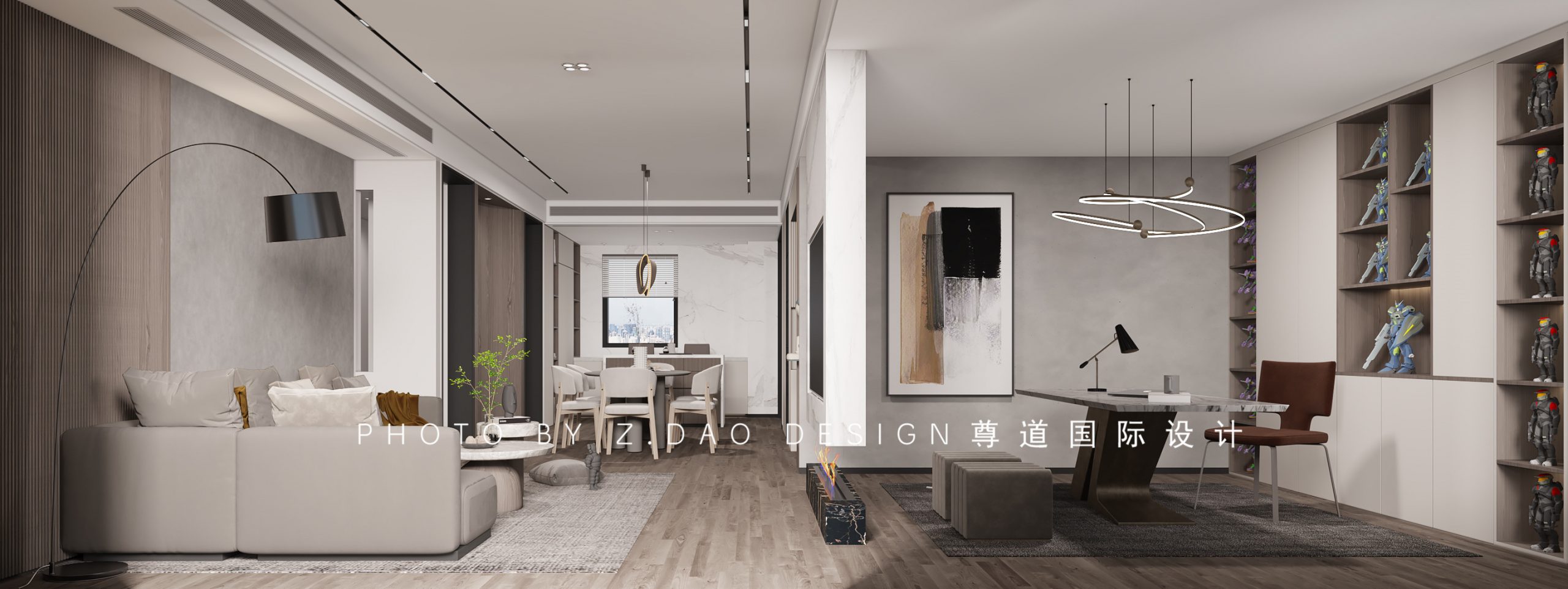 悬挂电视墙将书房与客厅隔开,形成两条双动线,划分两个不同功能区。