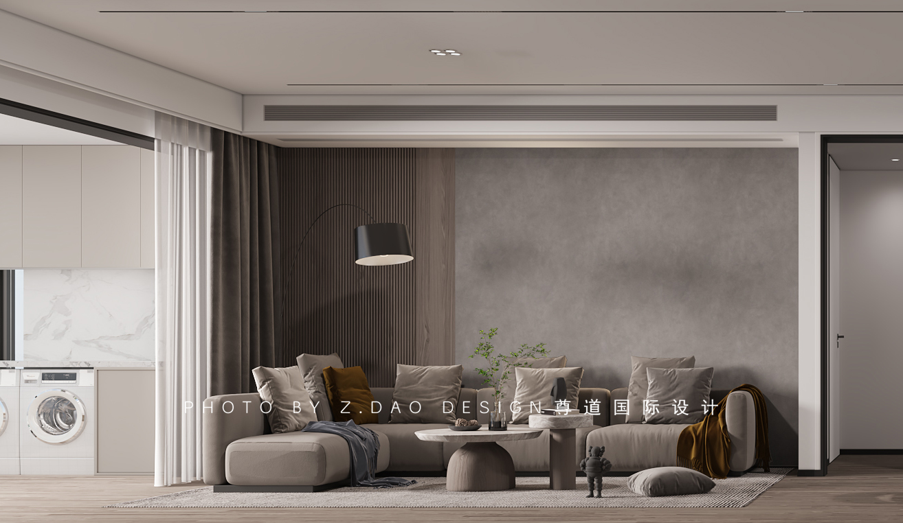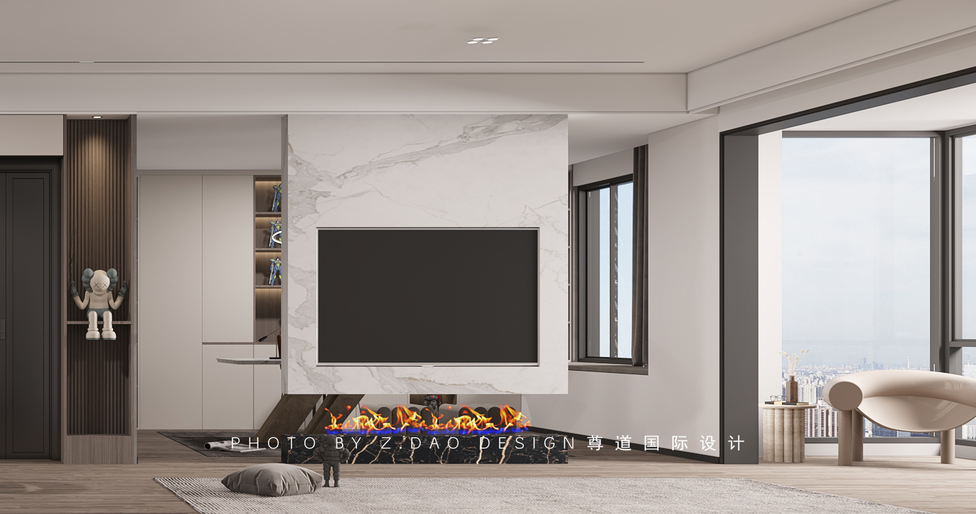 2、沙发背景砌墙,使空间拉直,边墙开窗穿景设计,引入过道光线。