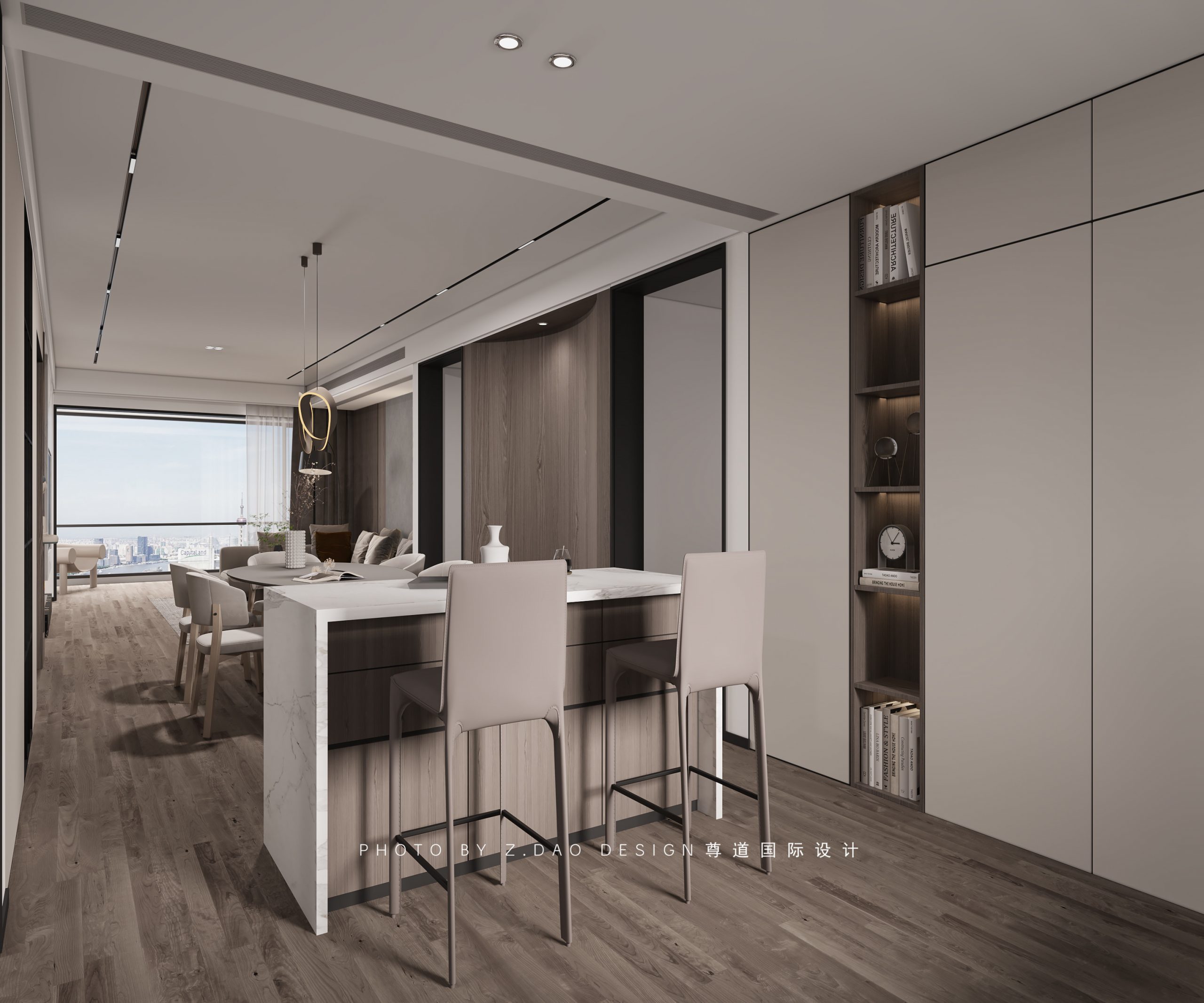 西厨将冰箱嵌入柜中,与两边的餐边柜和收纳柜融为一体,实用与美观共存。