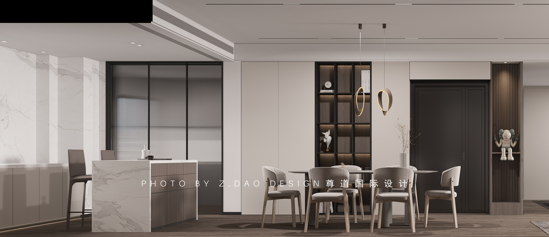 餐边柜用开放格分割,使餐边柜不单调和古板,同时与入户门右手边的展示柜相呼应。