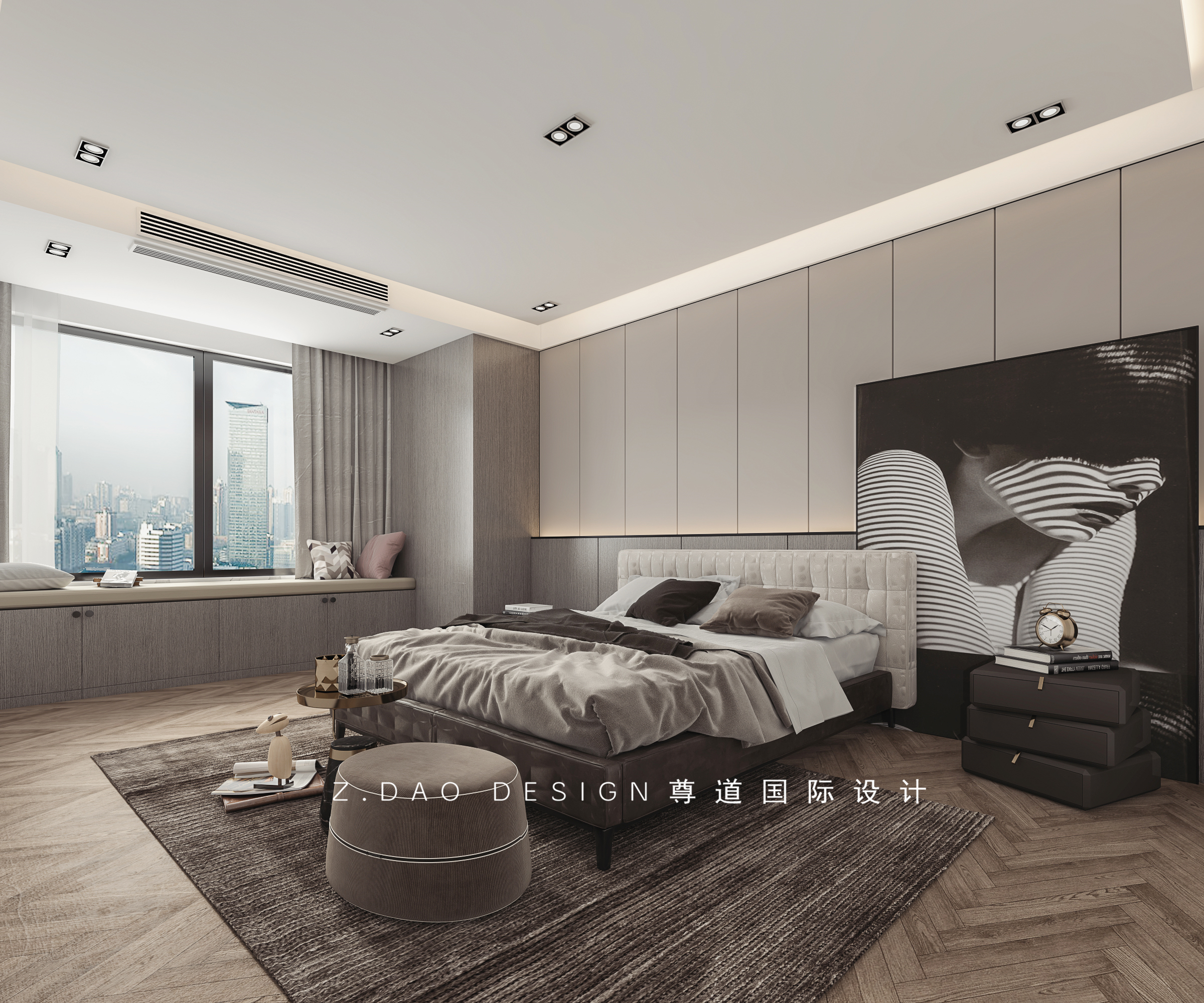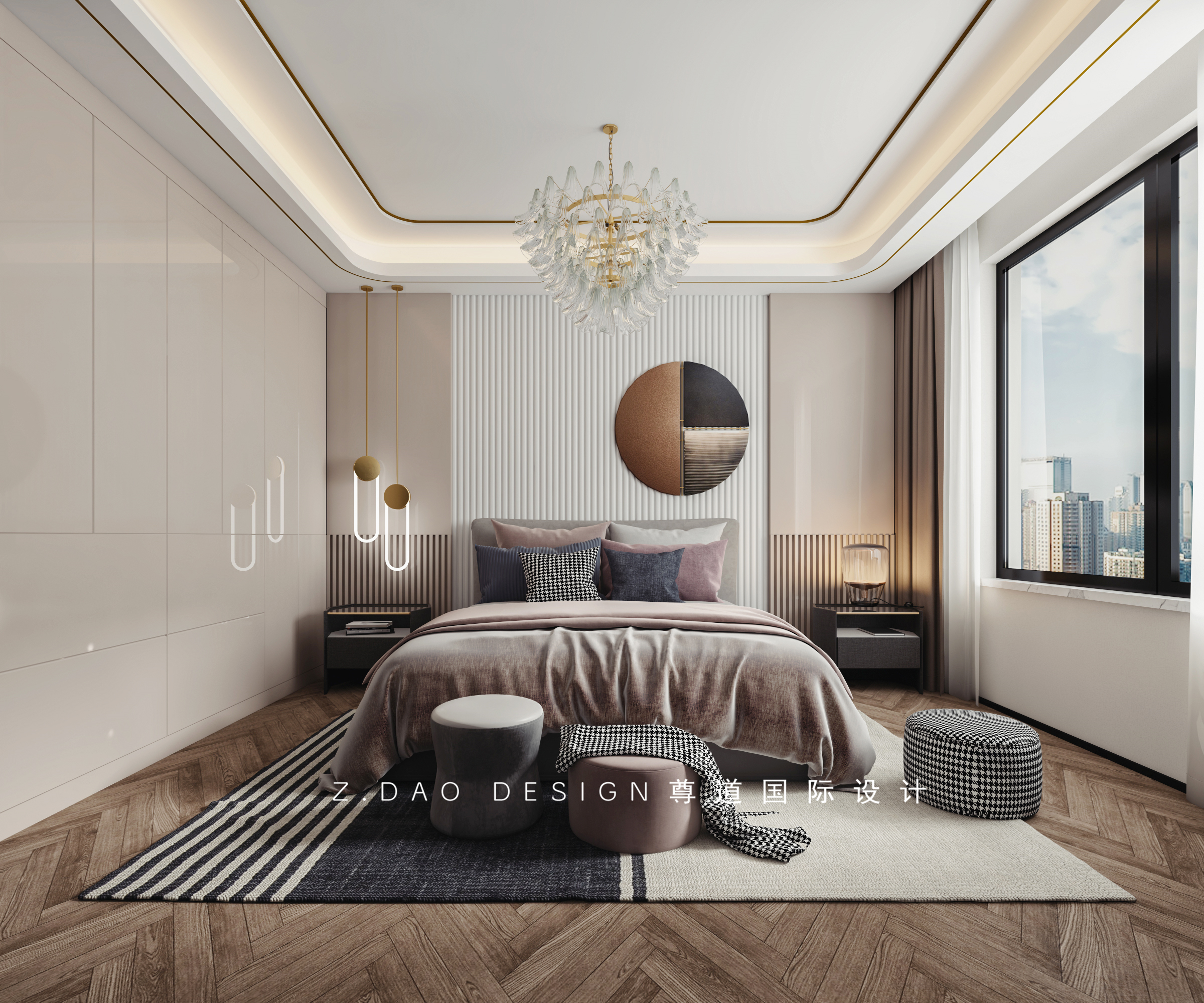 ▲主卧室,首先映入眼帘的是郁郁葱葱的山林之景,定制背景与床、柜交相呼应,床尾衣帽间的设置,赋予了空间更多的可能,搭以不同材质与肌理的配饰,尽展雅奢之风华。