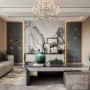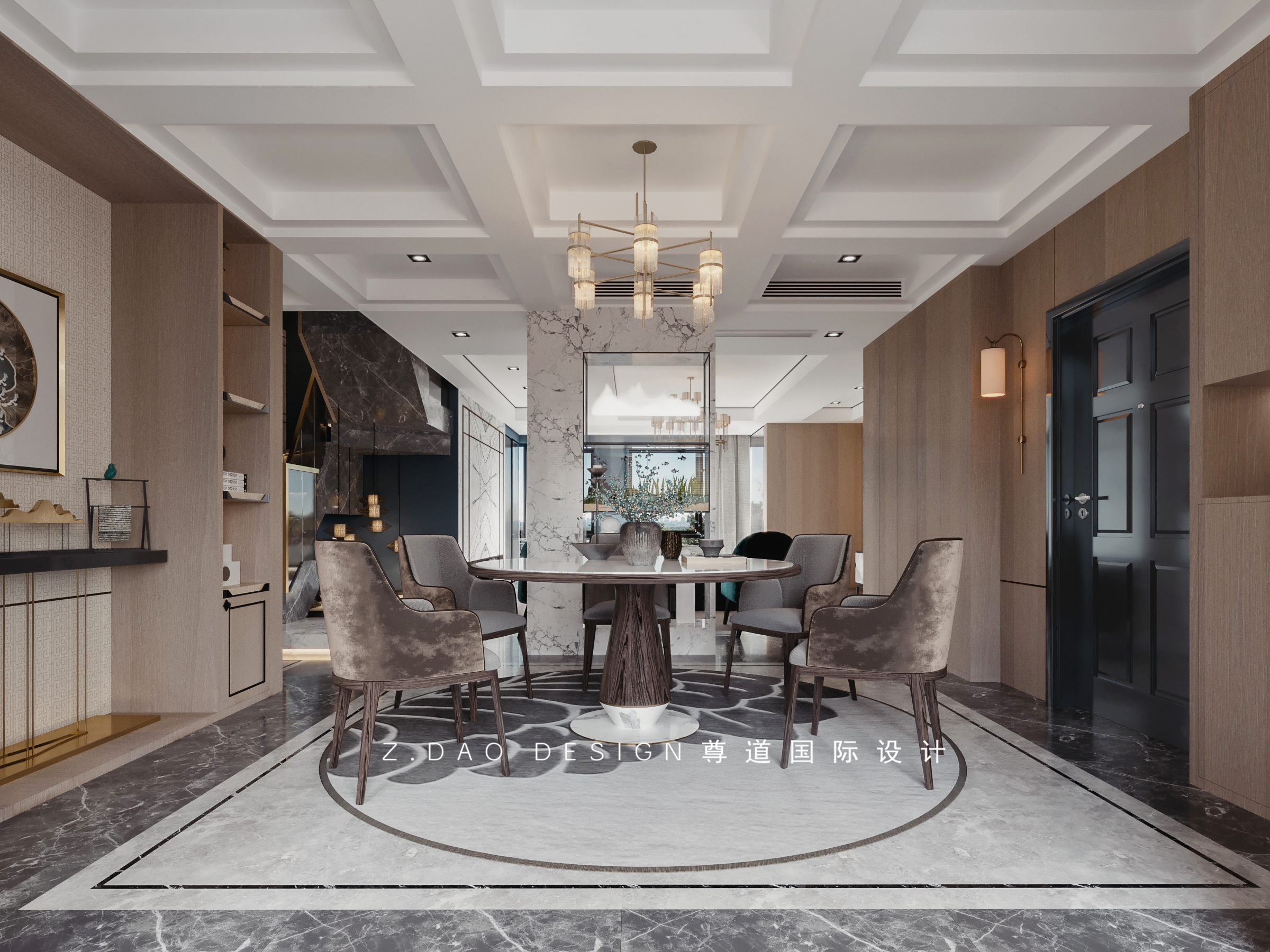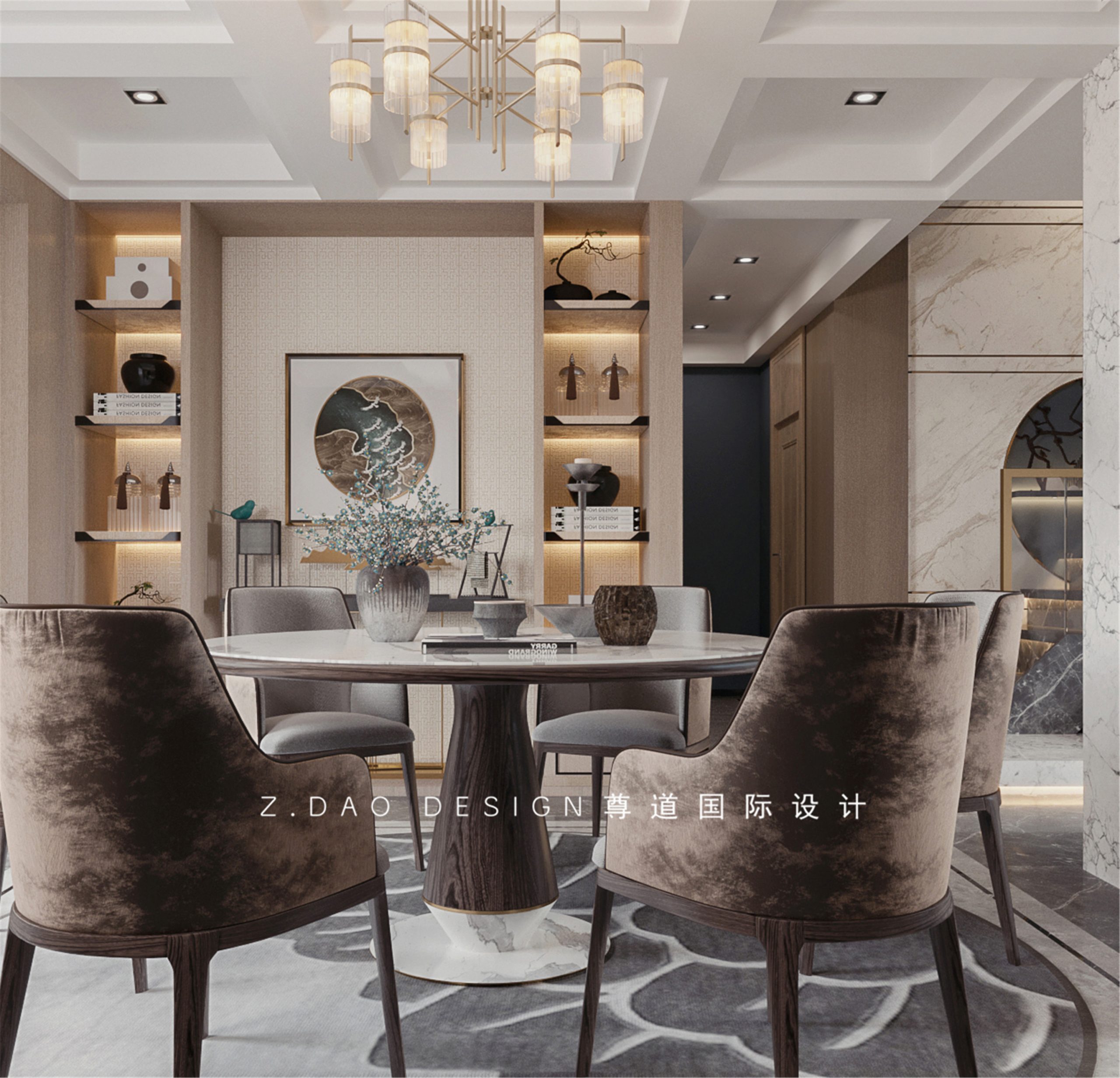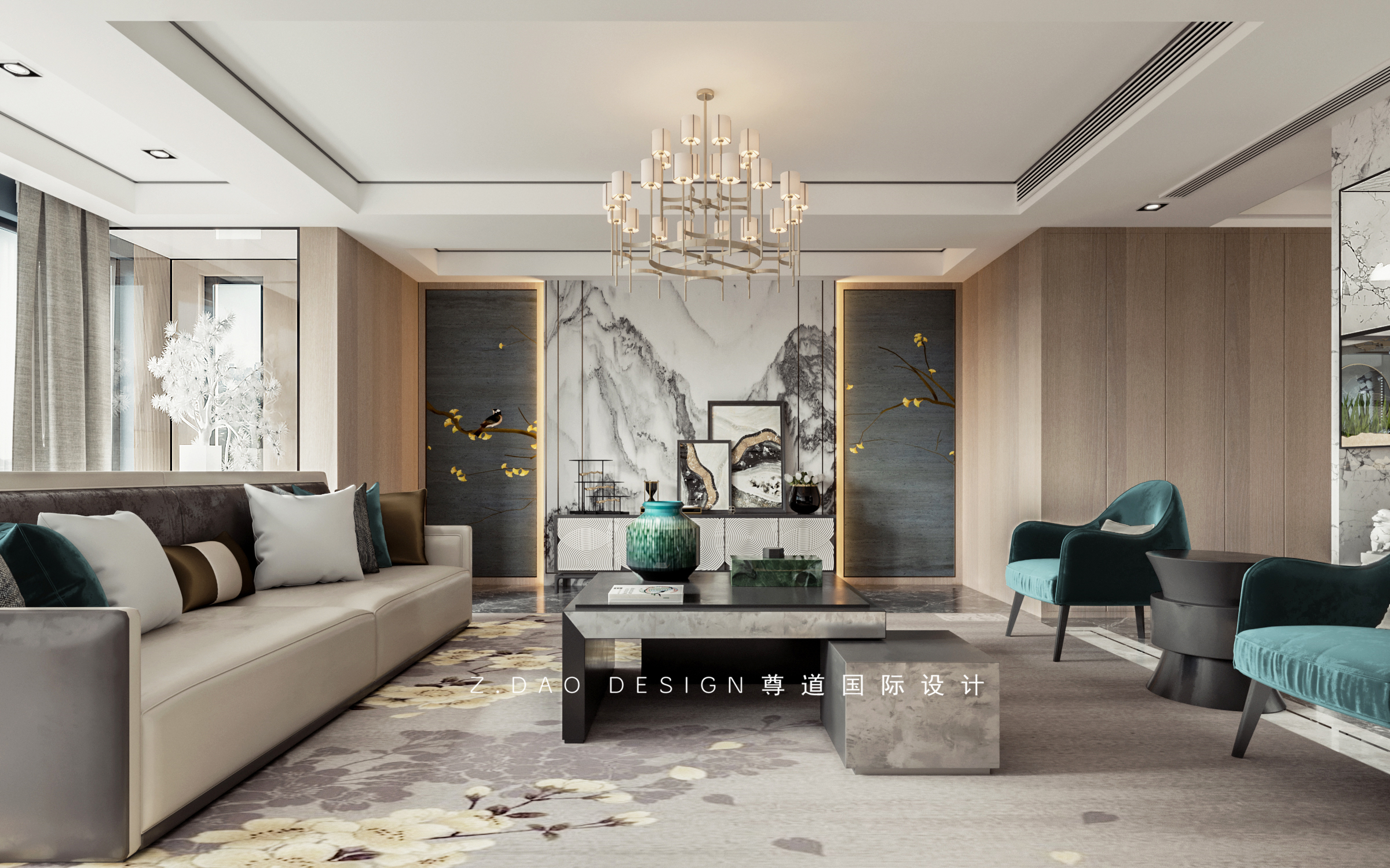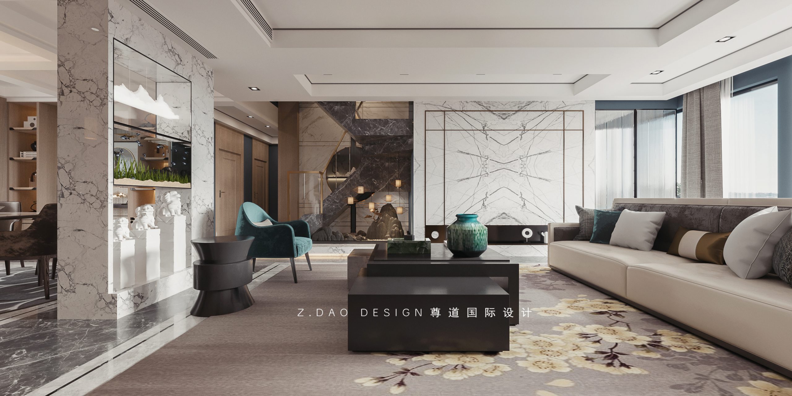 本案设计风格上采用新中式的设计手法,色彩以浅色系为主,山水大理石展现出中式水墨画元素,以及对生活品质的要求。