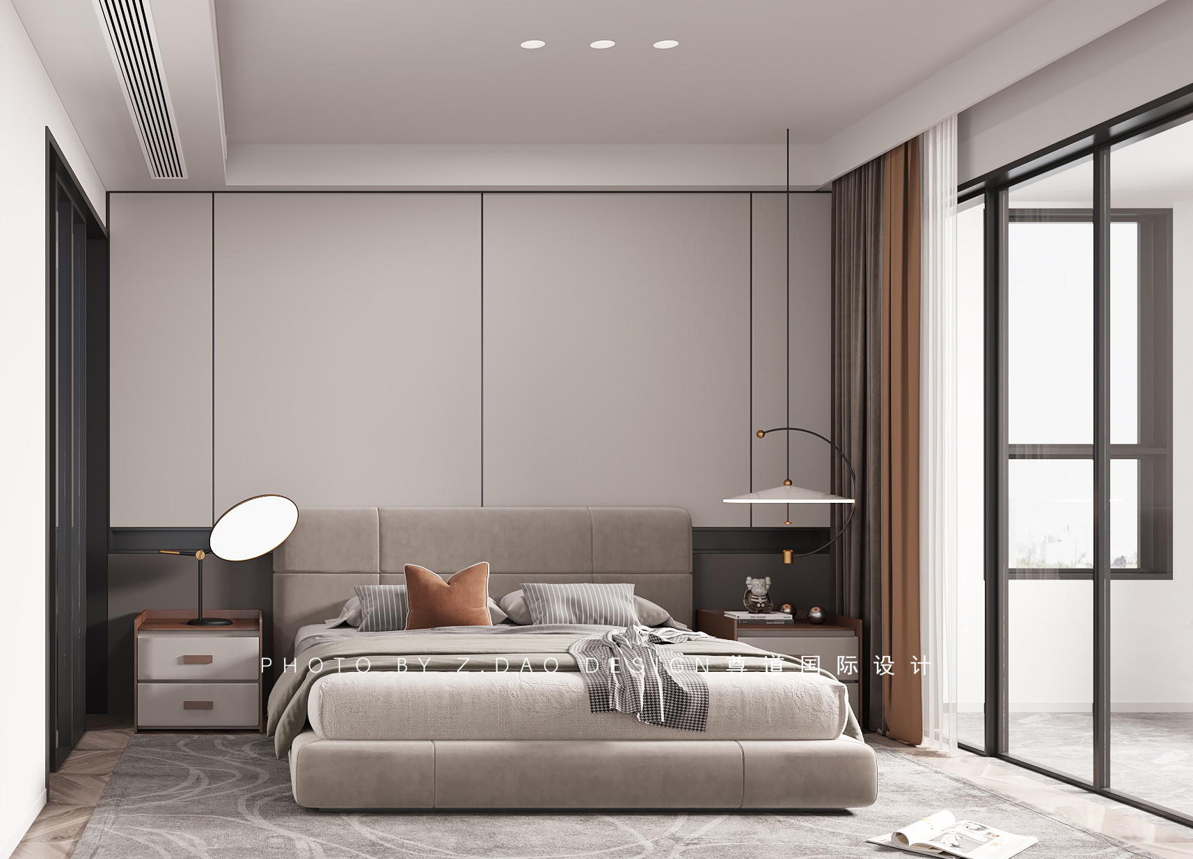 一字型的床头造型和无主灯的大面积平顶组合起来,使整个空间看起来非常的简洁大气。