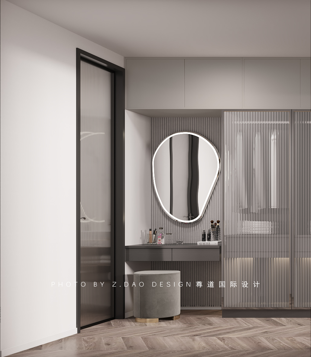 内梳妆台设置衣帽间里,便于业主生活的方式。地面采用人字性造型铺装方式,增加了地面的立体感。