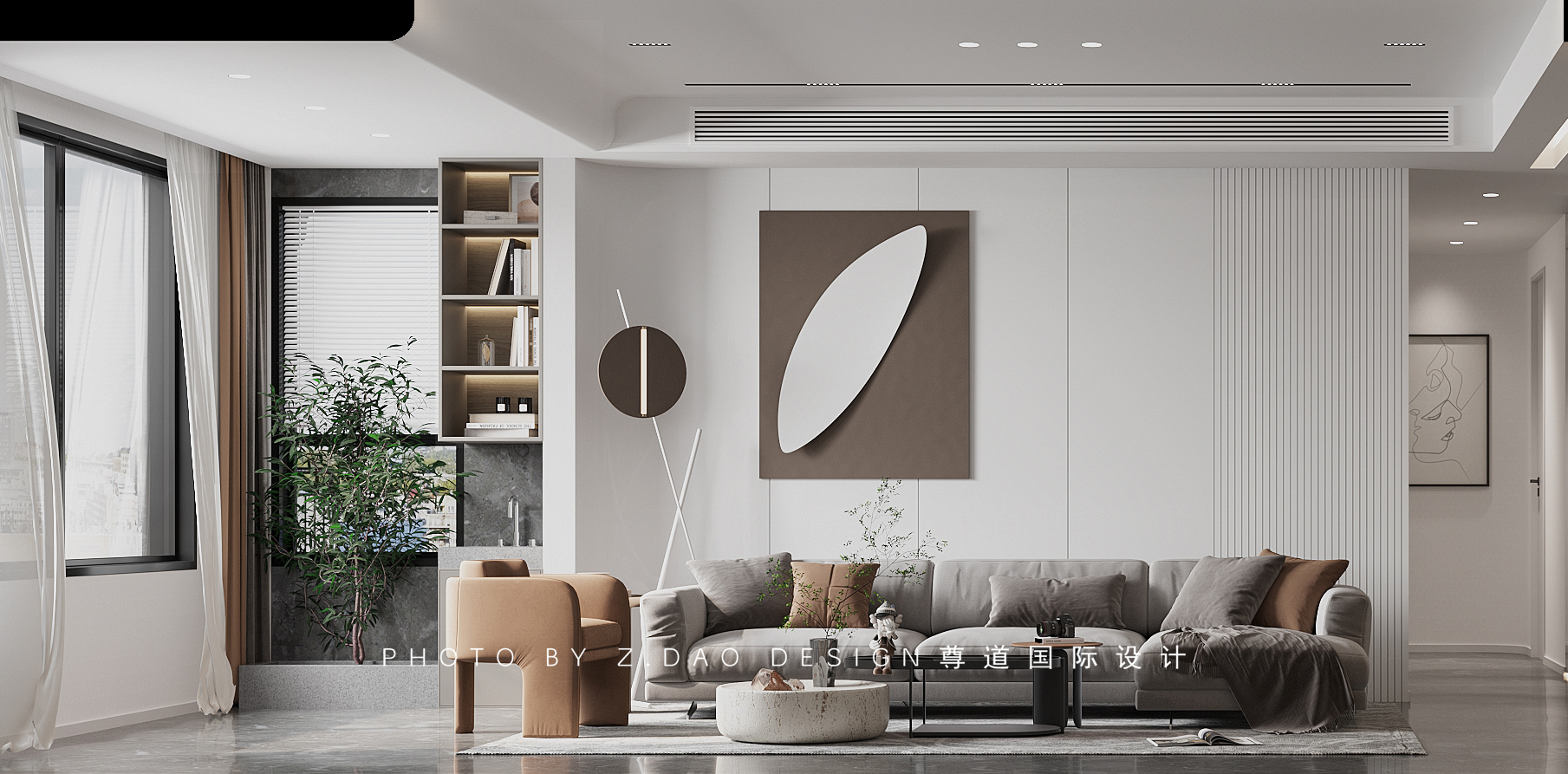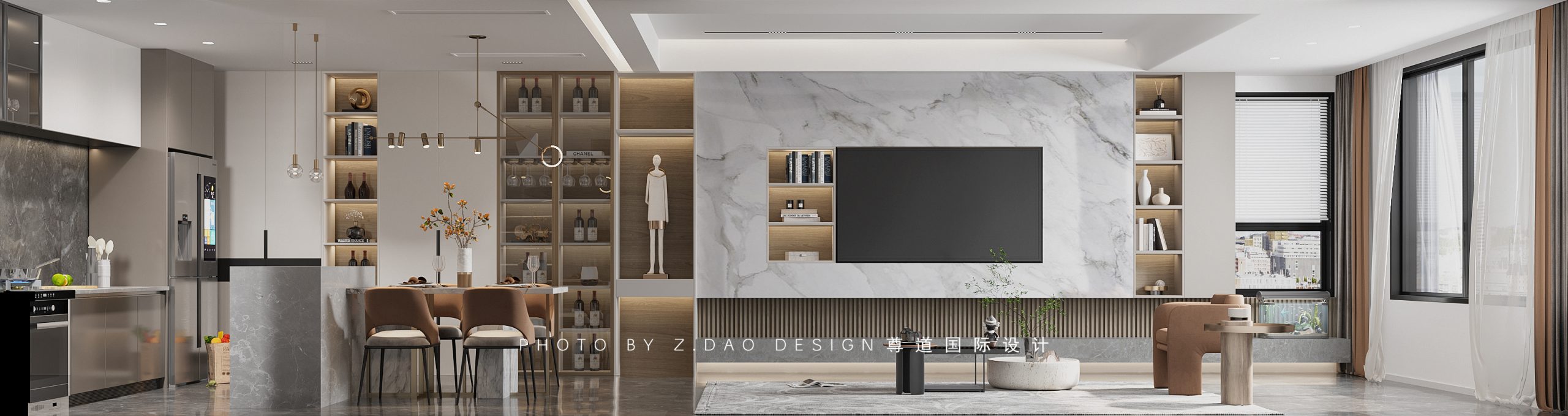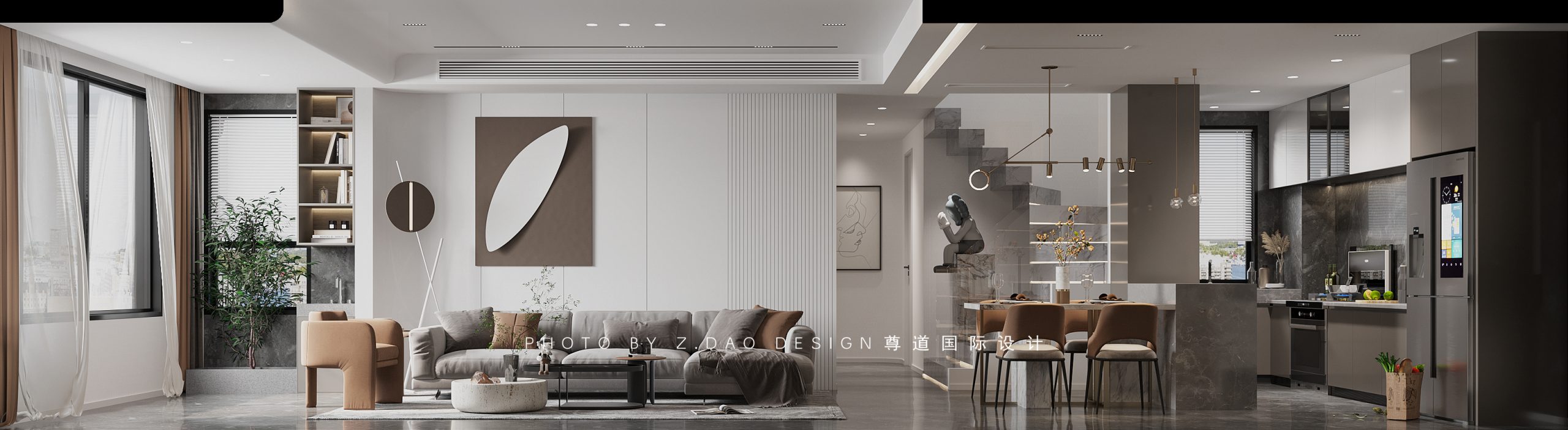整体色调以灰色为基调,入户正对弧形木饰面上墙的餐边背景墙,磁吸灯贯穿整个客餐厅顶面。客厅的整体天花吊顶采用大面积平顶,满足灯光亮化的同时,拓展了空间变大的视觉效果。