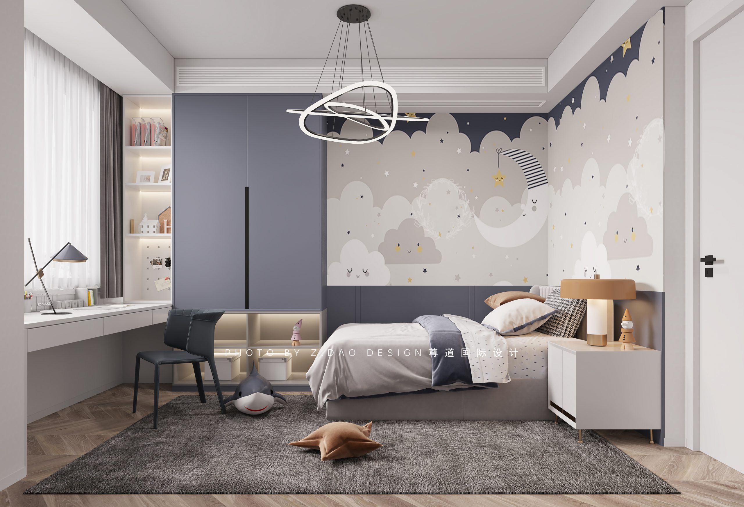 西边的儿童房作为小儿子的房间,墙面采用定制壁画,增加了空间氛围,也增加了房间的童趣。衣柜下口做开放格便于儿童玩耍随时堆放玩具;飘窗柜拆除后重新设计成书桌,空间更大的利用了起来。