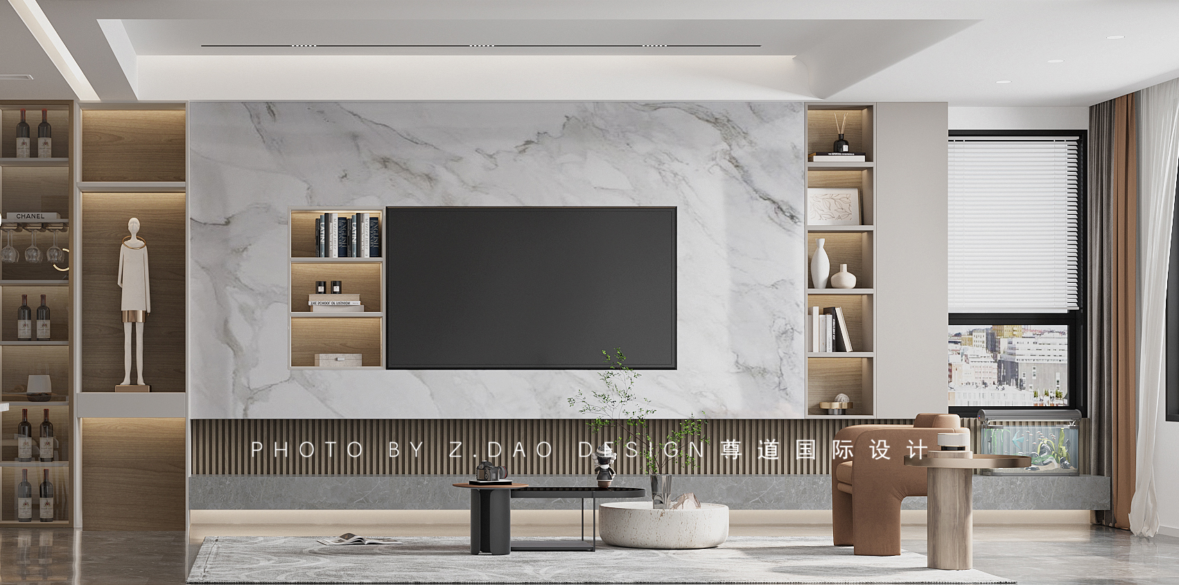 电视柜采用定制一字型地台,拓展电视背景视觉。