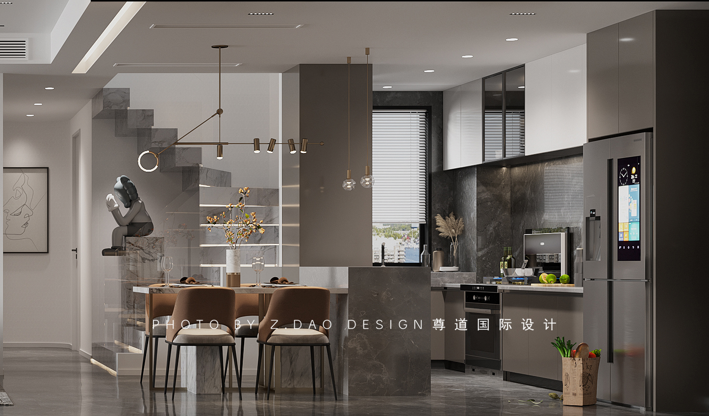 开放式的厨房,让客餐厨整体空间拉大,橱柜和吧台餐桌的结合,增加了橱柜的操作台面,也提升了生活的仪式感。