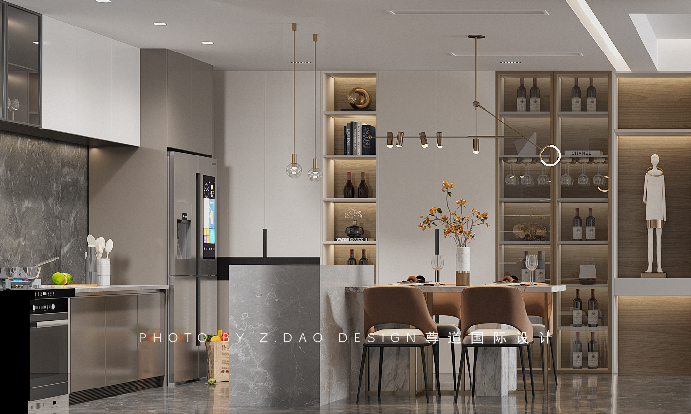 餐厨背景柜的设计上面,柜体采用了虚实结合,门板使用铣槽拉手、铝框玻璃门和覆膜板柜门,柜体预留氛围灯,加上后期软装摆件,最终呈现柜体美学。