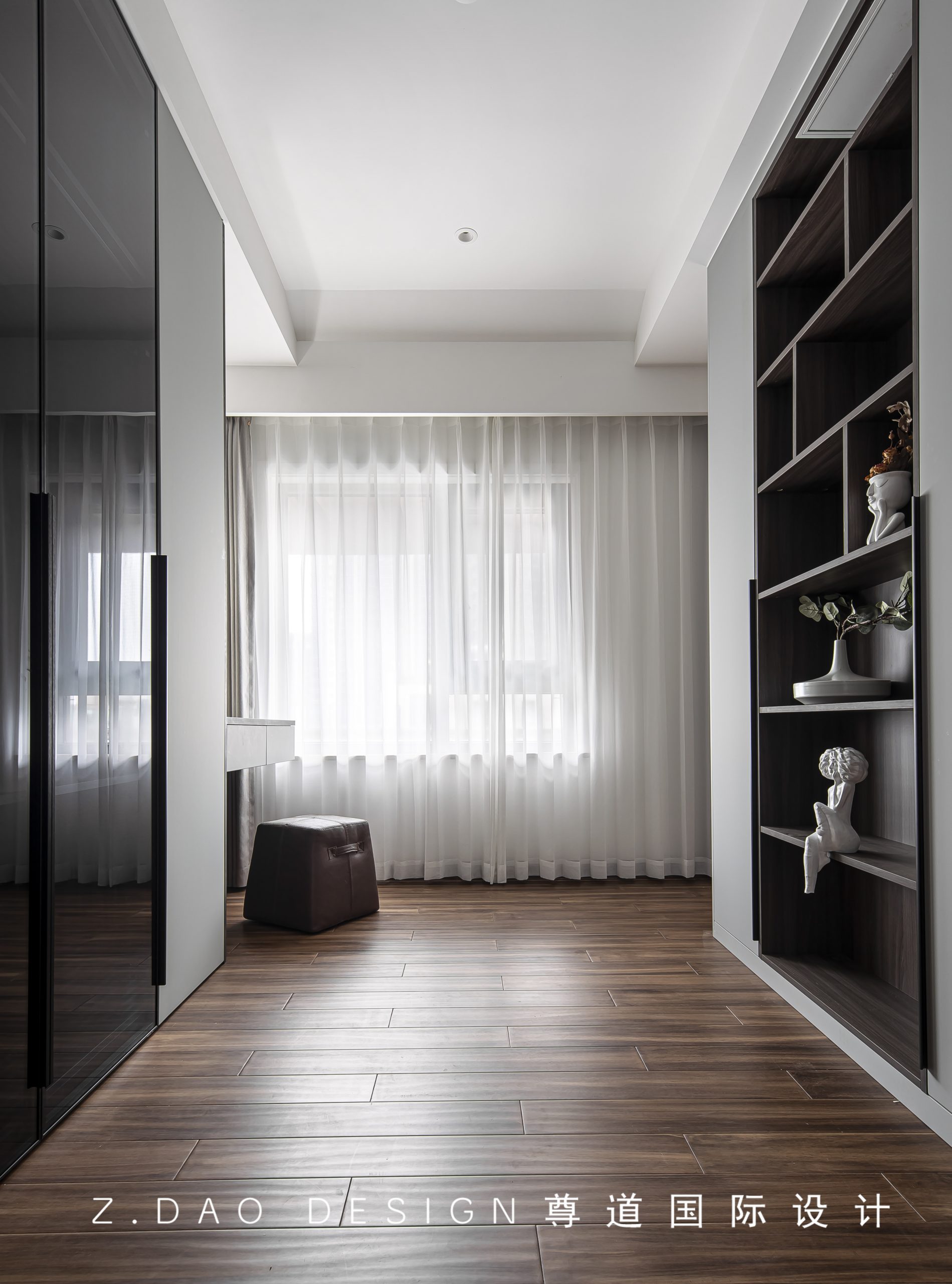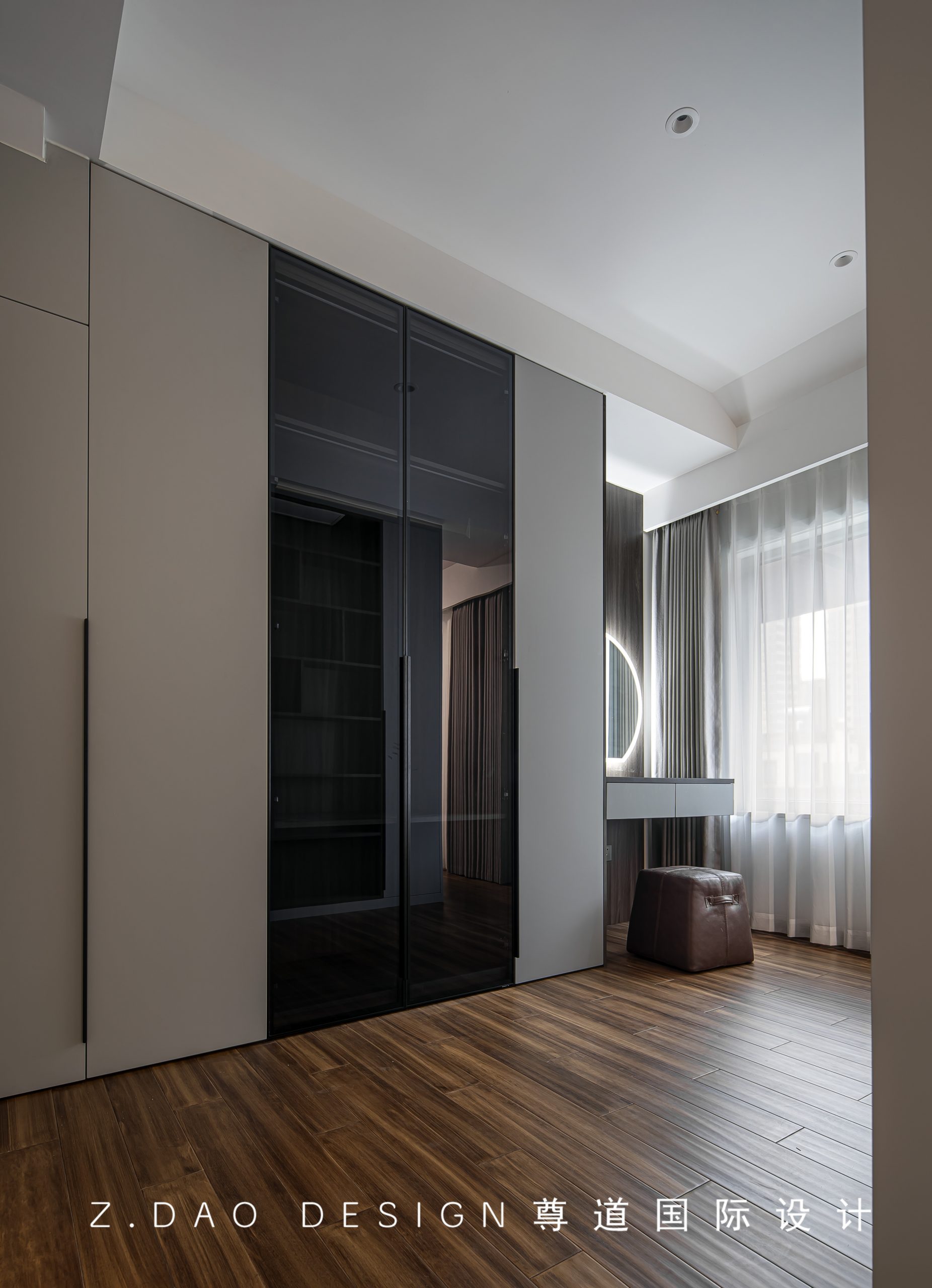 衣帽间同时兼顾梳妆台,柜门兼顾玻璃与木质材质,材质糅合穿插,维持形态统一的氛围感。