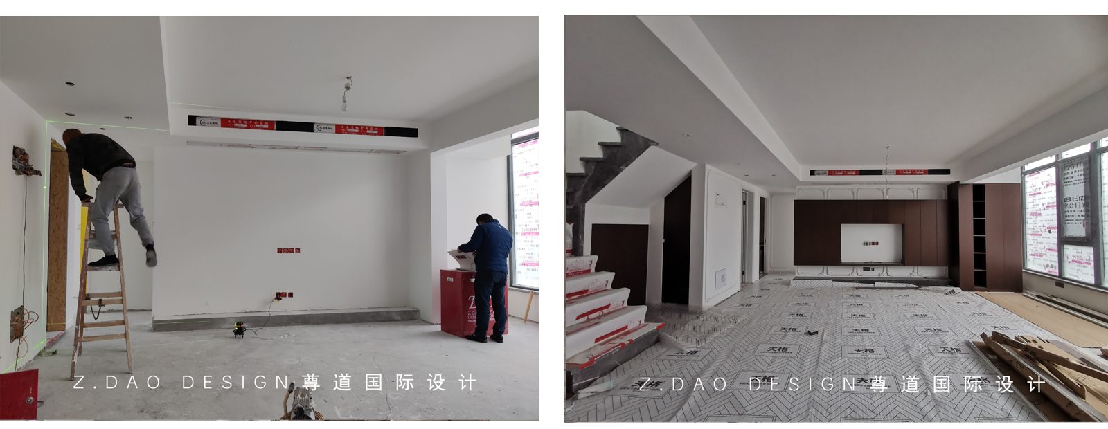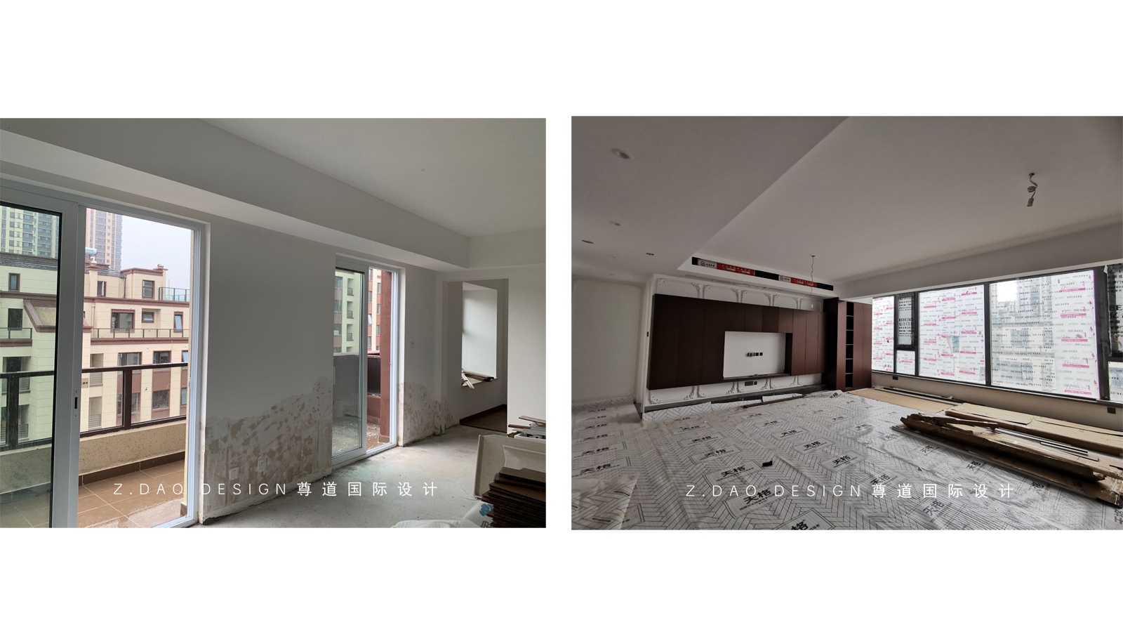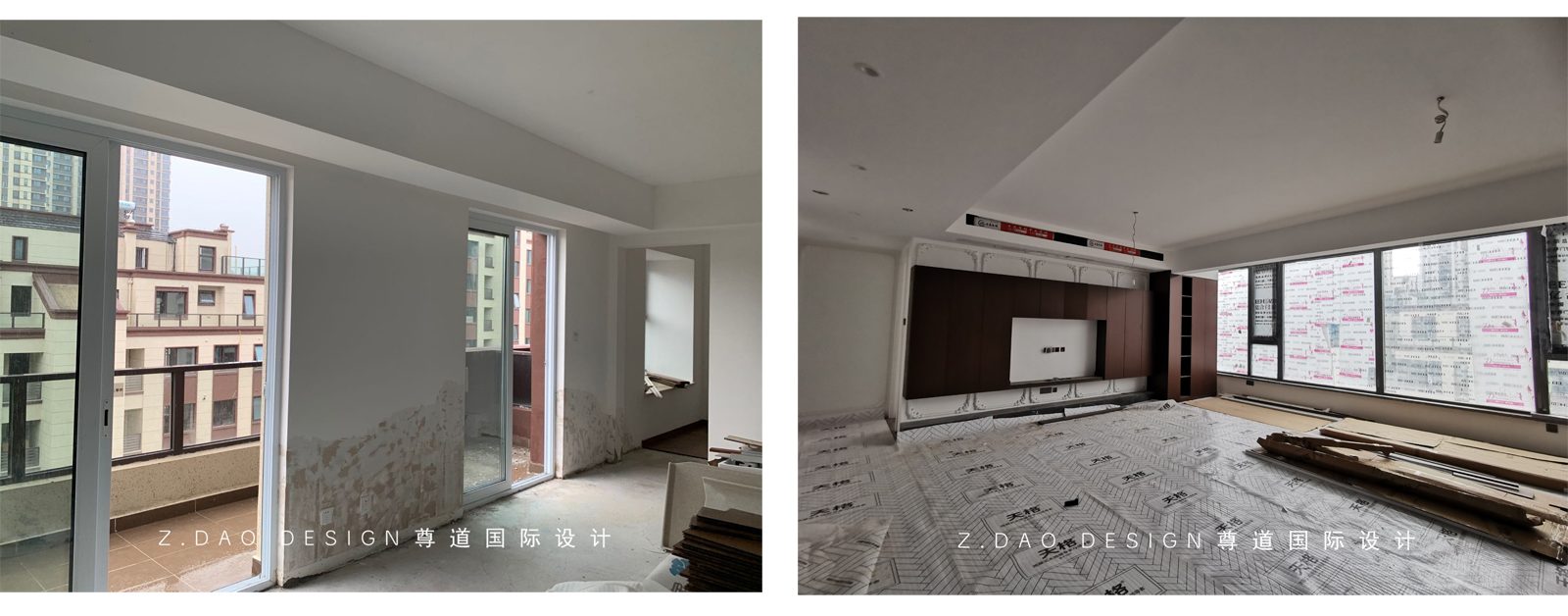 改造前客厅阳台处与改造后安装阶段对比,阳台已纳入室内,扩大了室内空间。