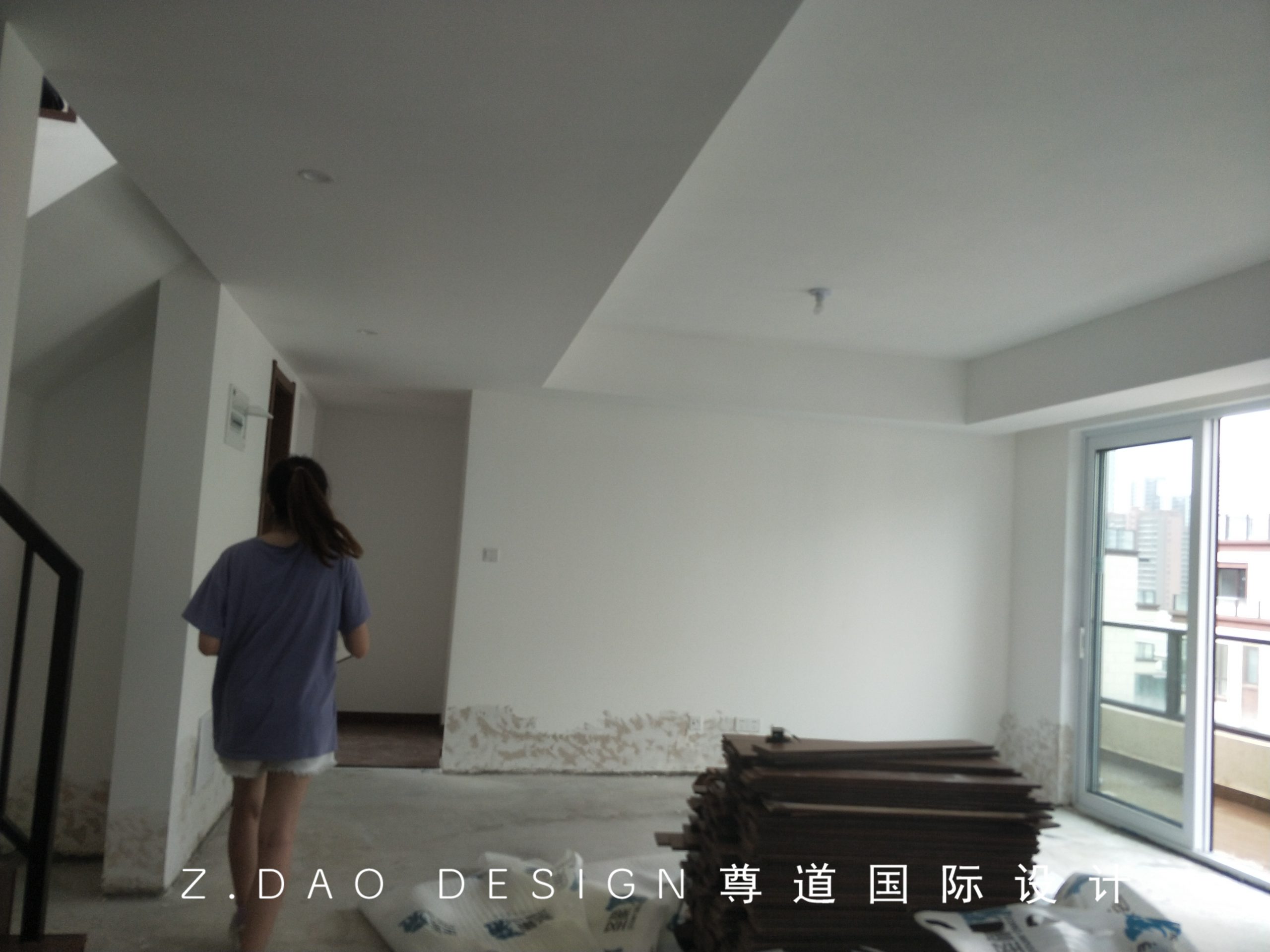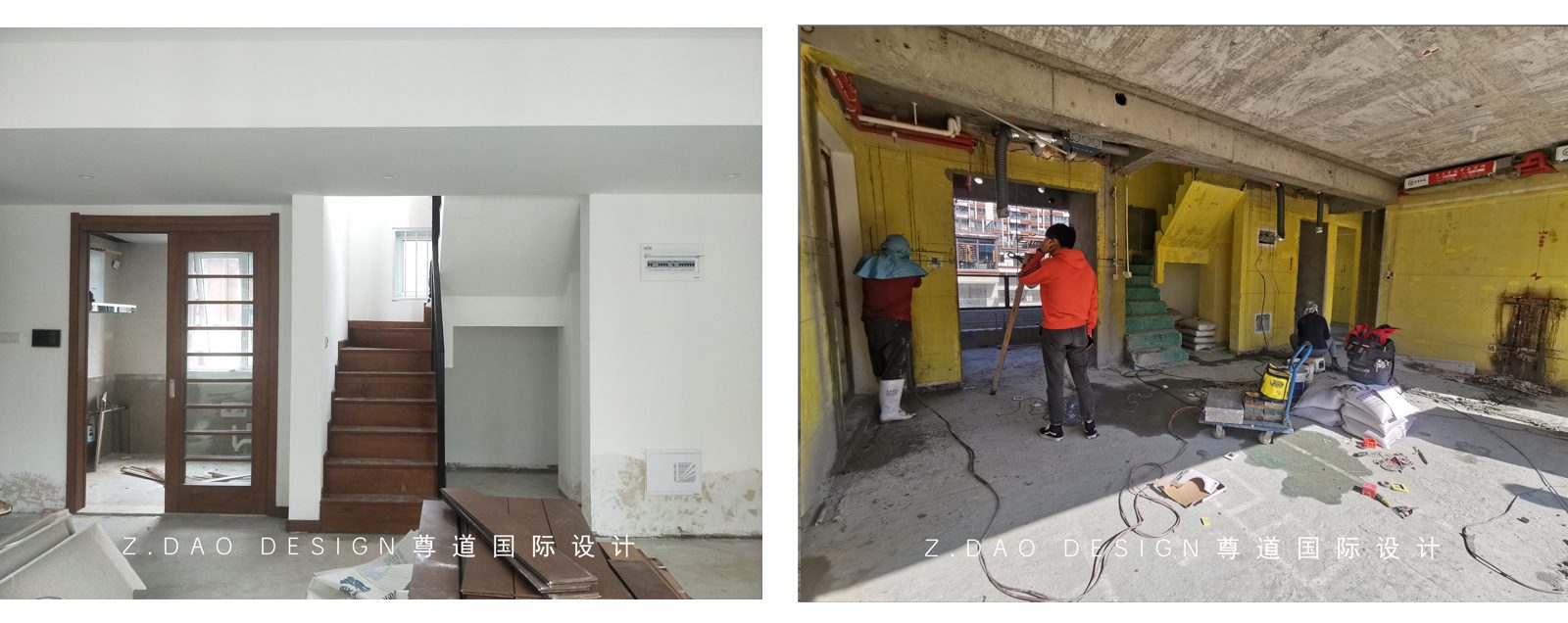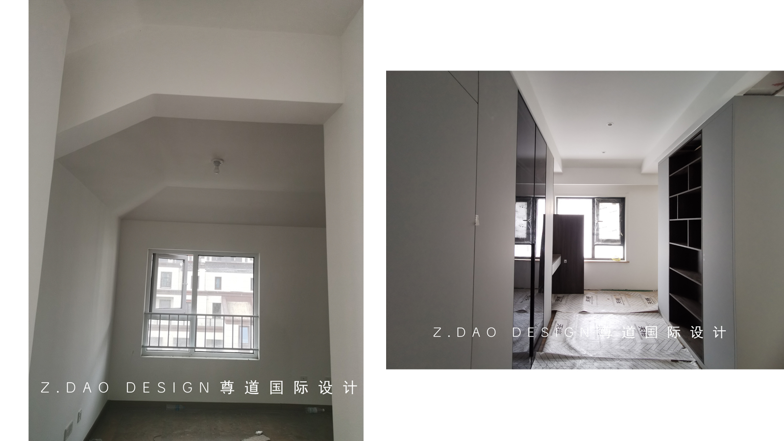 改造前客厅阳台处与改造后安装阶段对比,阳台已纳入室内,扩大了室内空间。
