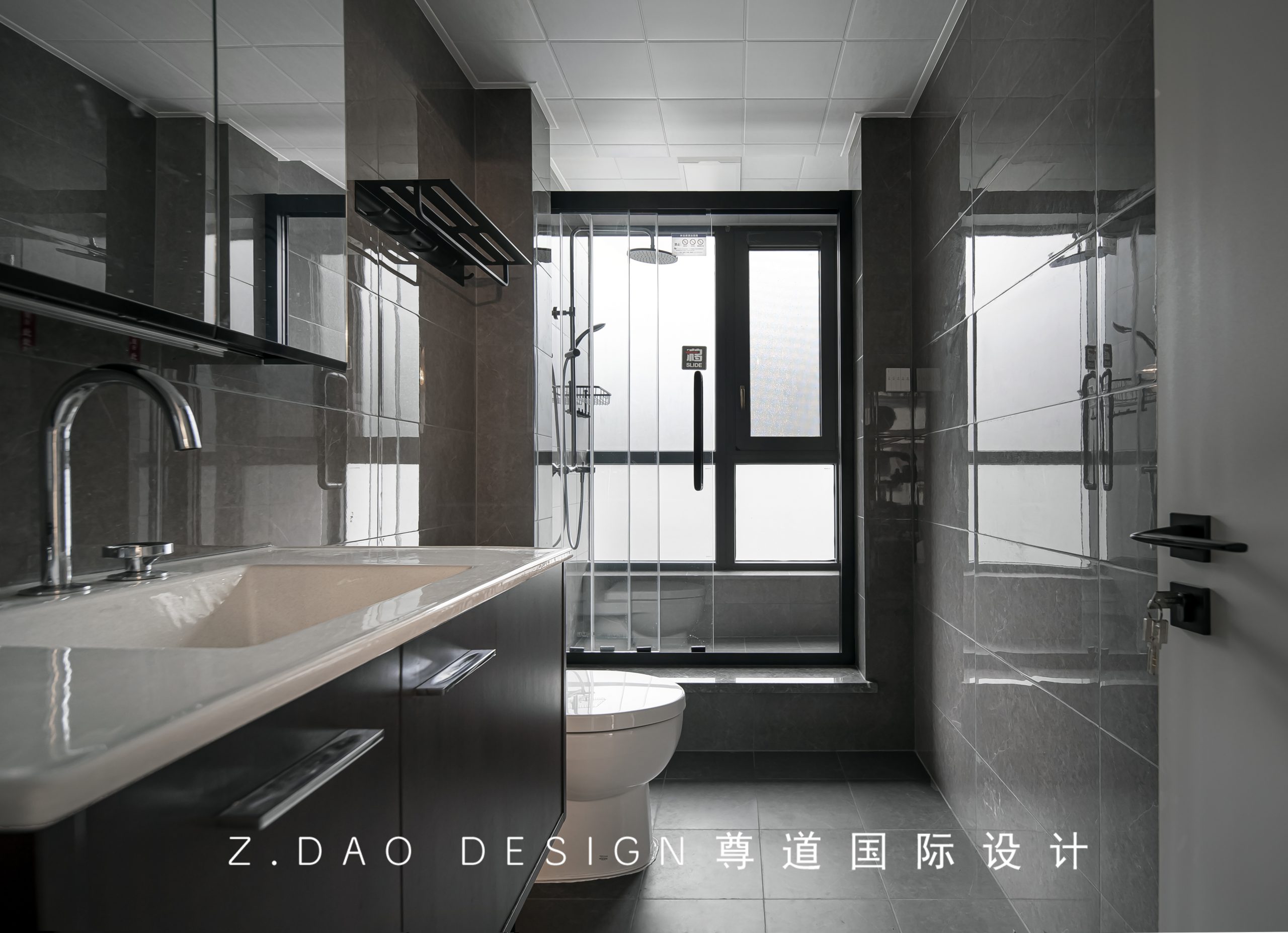 一楼卫生间经过外部阳台的空间纳入,也得到了很大的扩展,采用了干湿分离的设计,不同材质的灰,化解统一的单调无聊,展现出空间的简约别致。