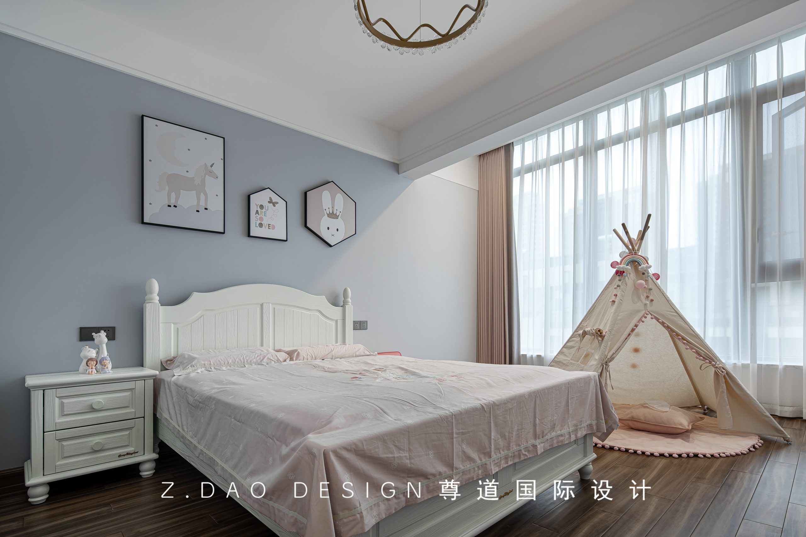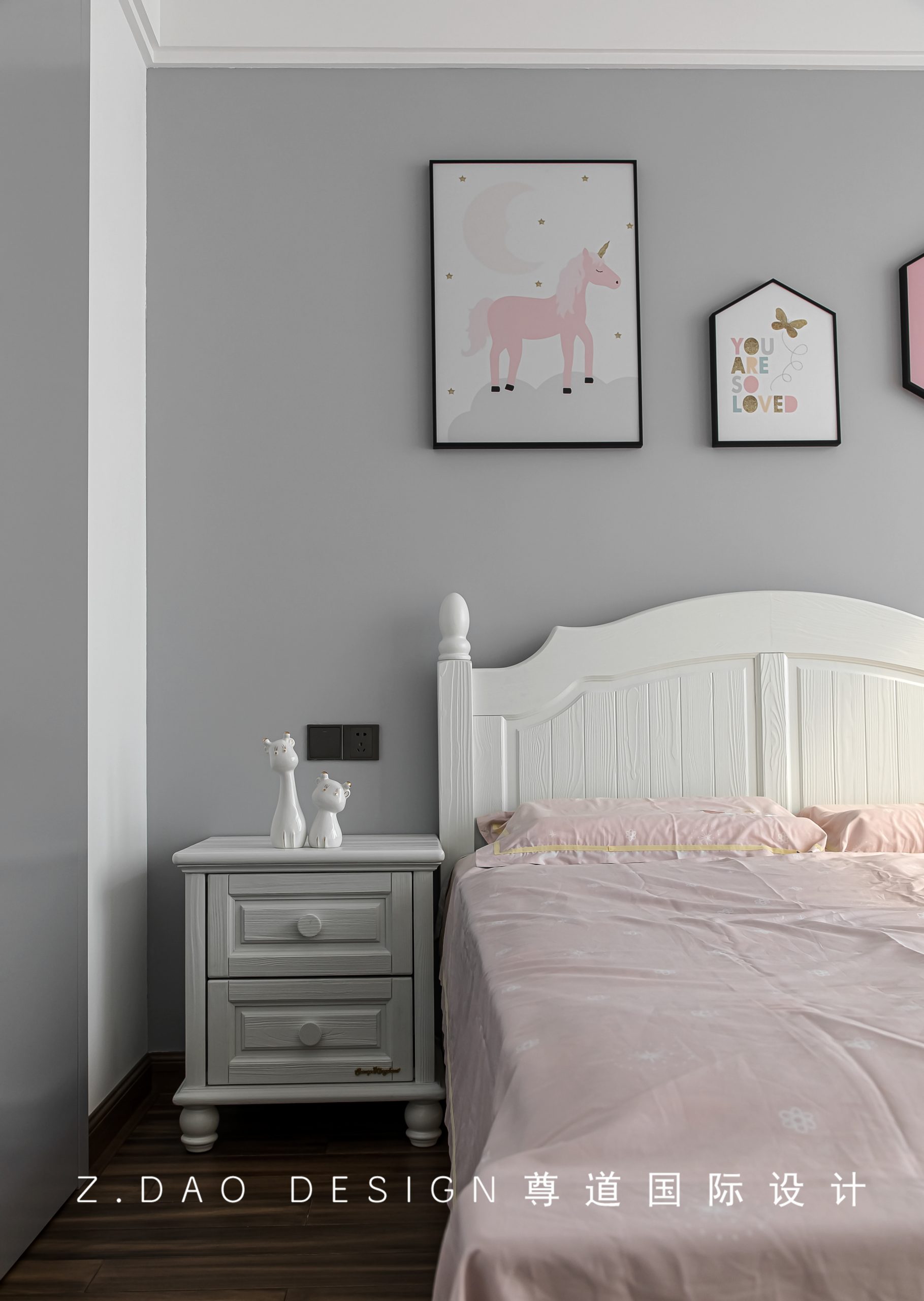 在方案沟通上,我们决定保留空间感和灵活性,便于小孩长大后能有拓展变换的空间,所以主要是通过色调搭配和软装的选择来营造氛围。墙面特意选择的灰色,平衡了女孩子们喜欢的粉红色,甜蜜中带着清爽,耐看、舒适。