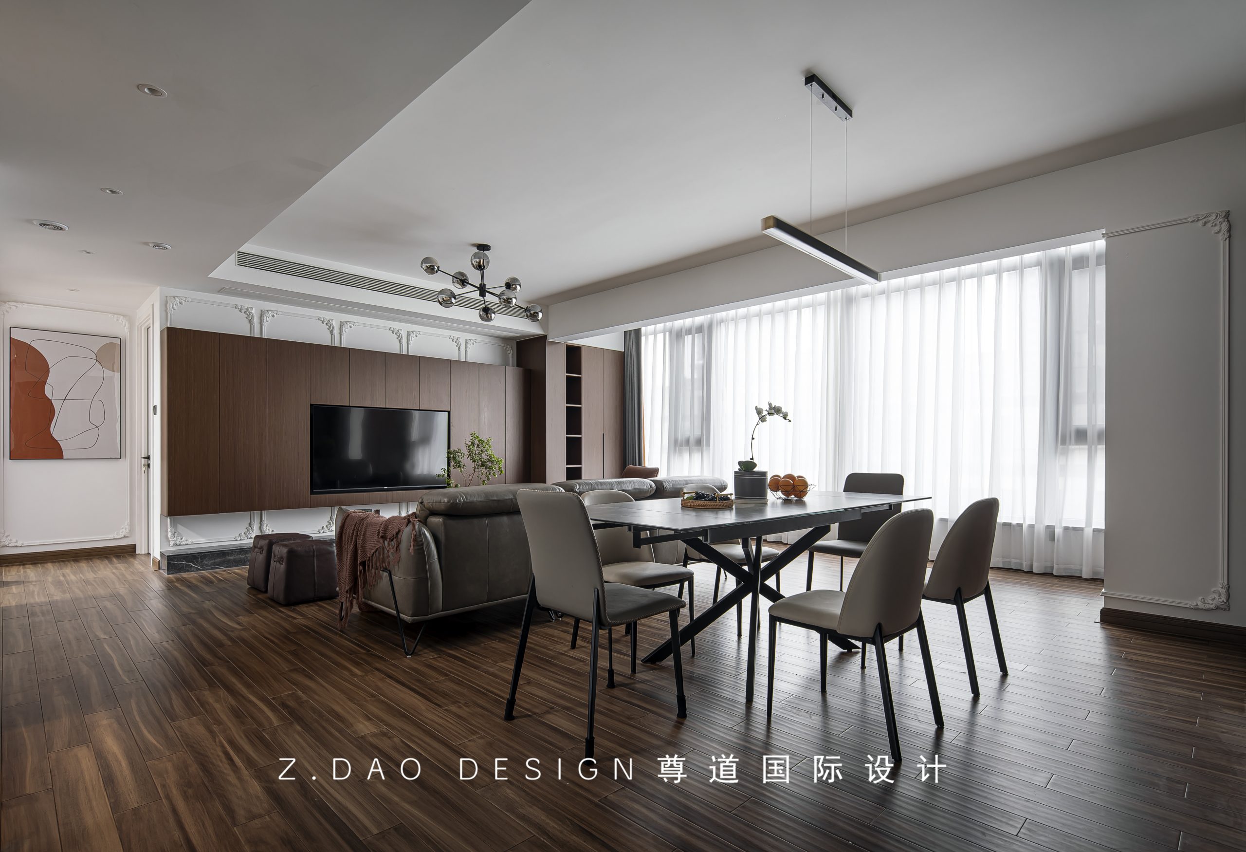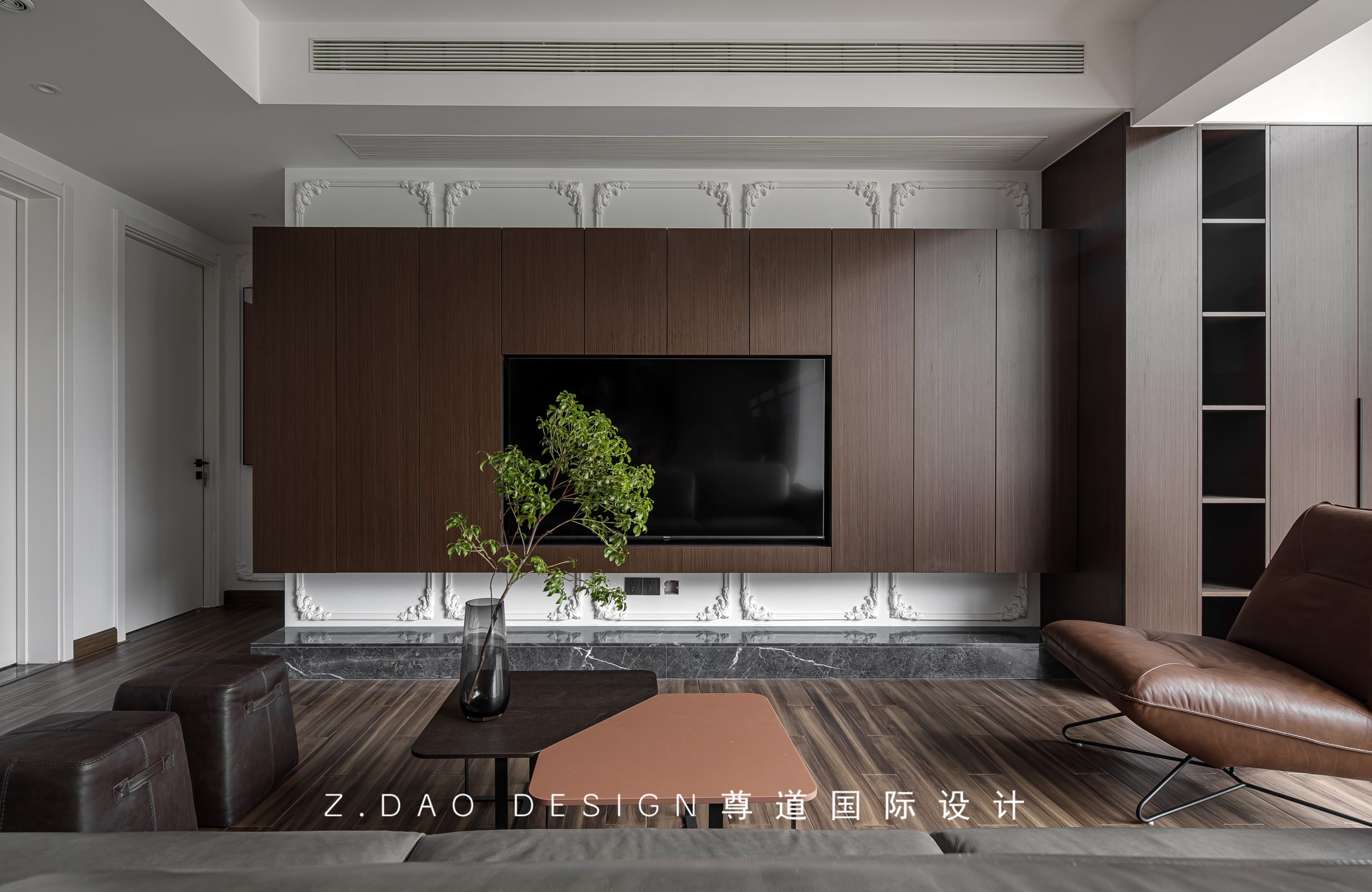 我们以意式线条,柜体以块面穿插,电视内嵌,符合现代简约空间定义的“隐藏式收纳”,营造出干净利落的视觉效果,让空间始终维持在一种简洁、高级的氛围感受。