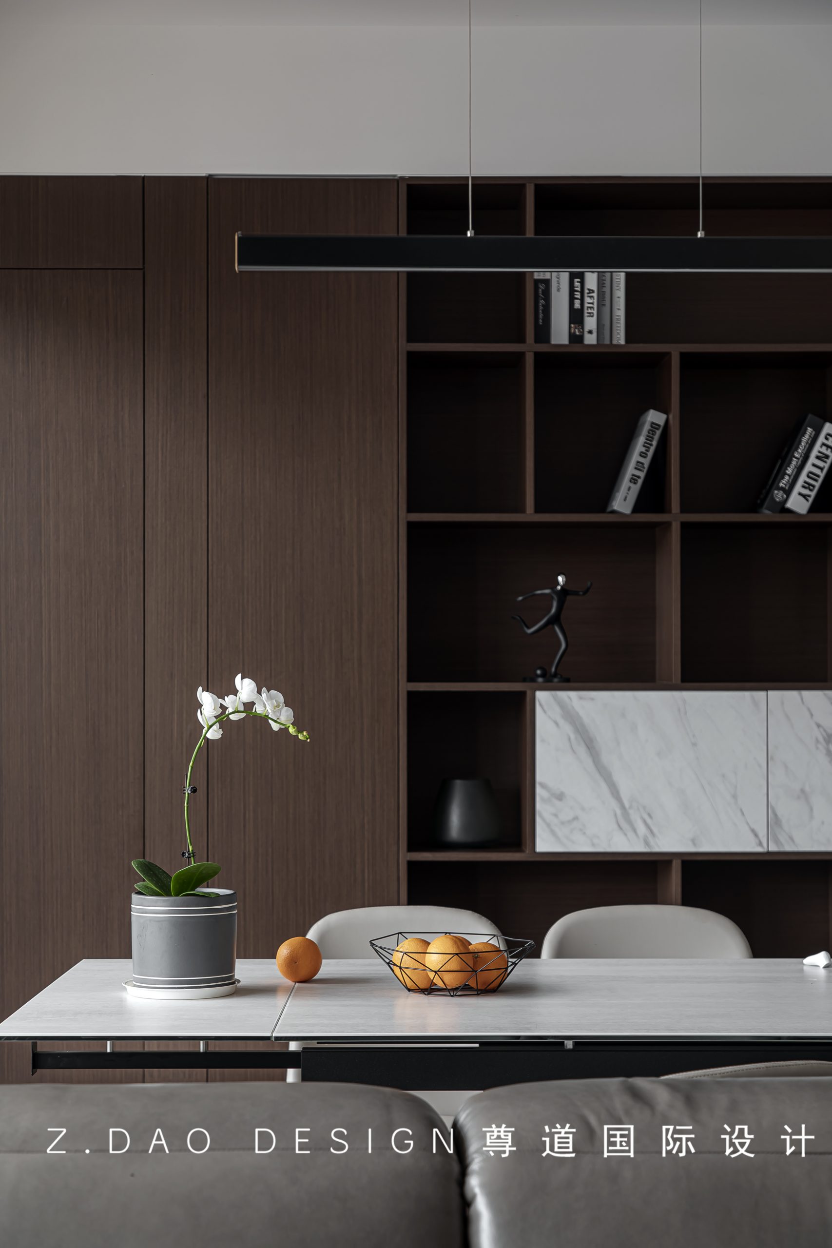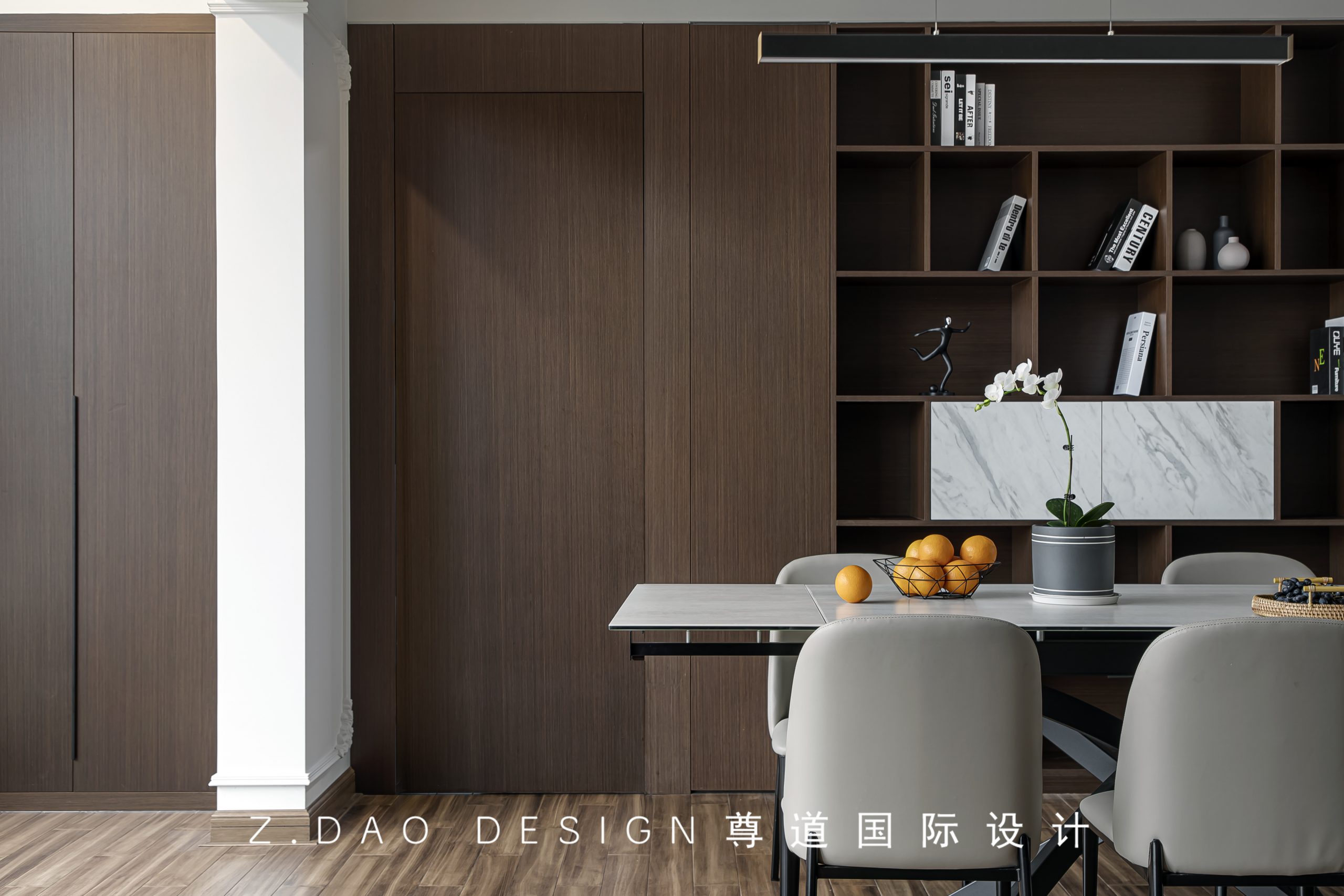 胡桃色的餐边柜以及隐形门,运用块面构成、材质呼应的设计手法,任何角度都保持一致的视觉体验,让餐厅空间更为整体,收纳空间更加充足。将功能与美学结合,空间的每一处都需细细考量。