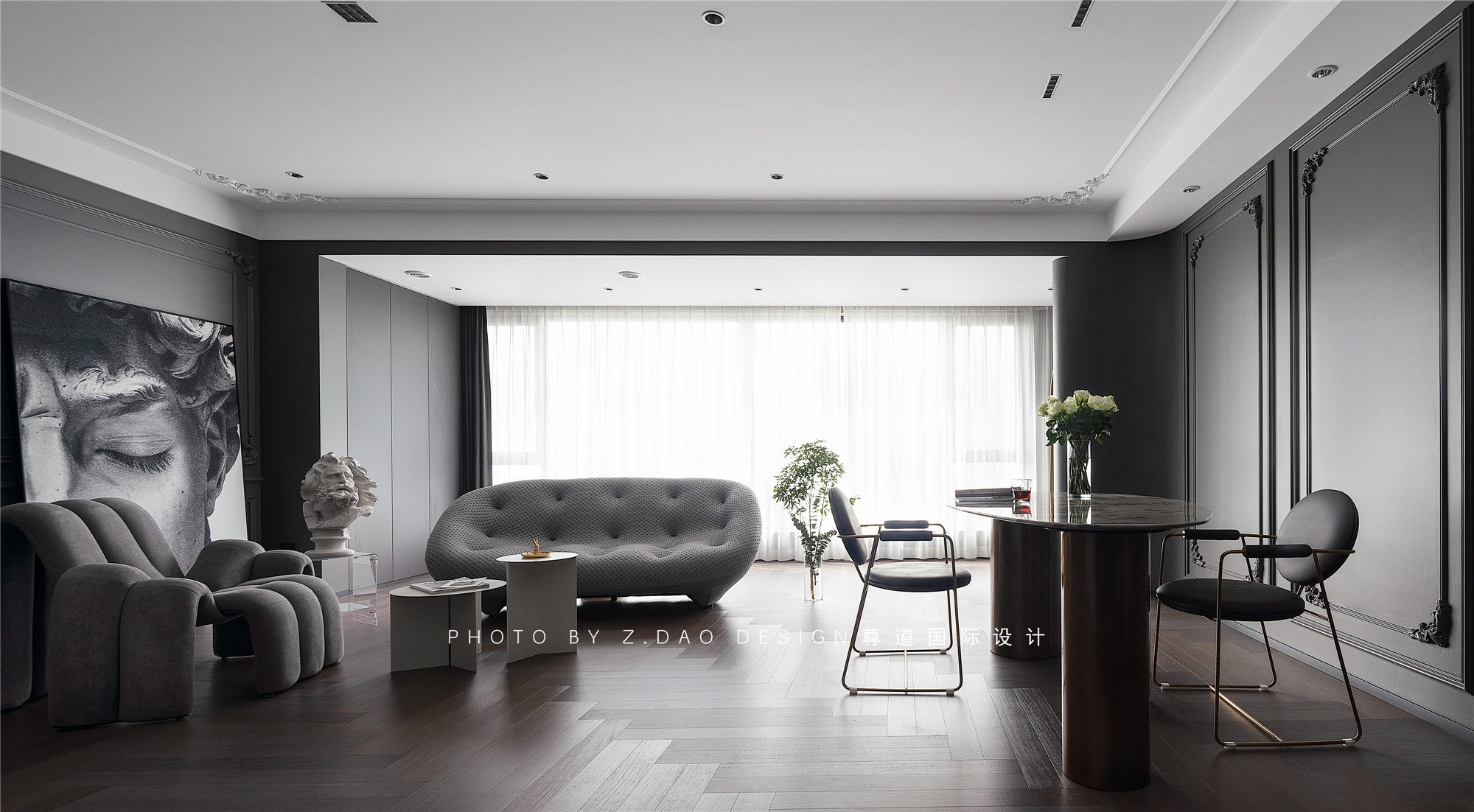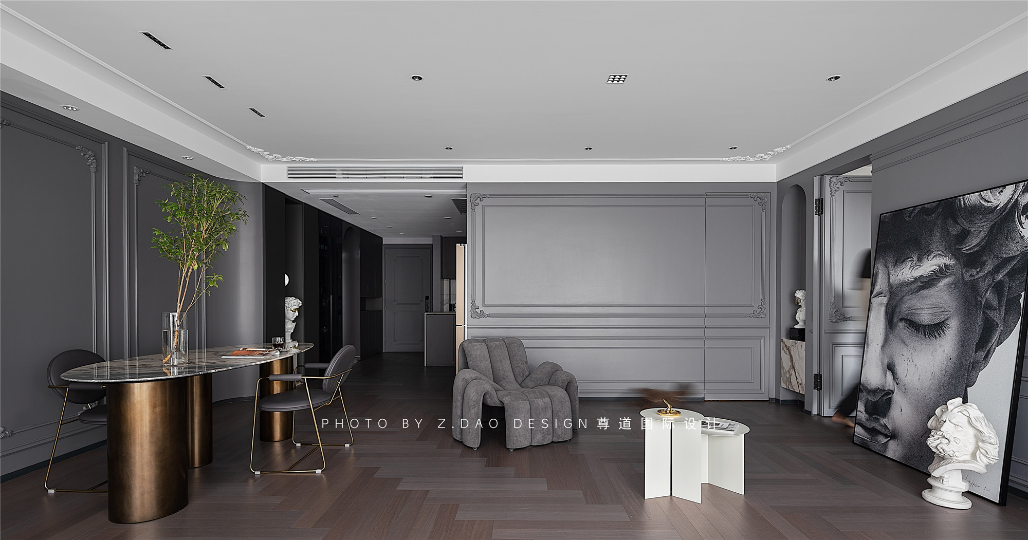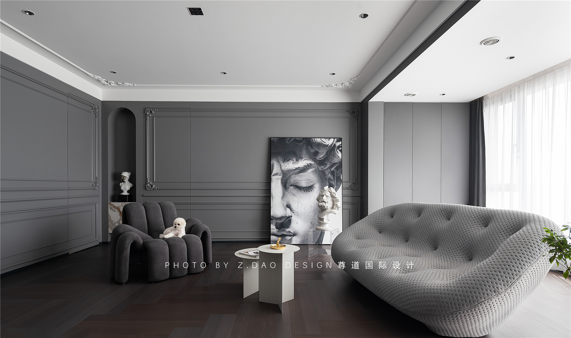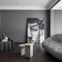水泥灰墙面、沙发、装饰画与雕塑、茶几混搭,形成明暗对比制造戏剧化的张力,让空间充满故事性,赋予法式风格更加时尚的基调。