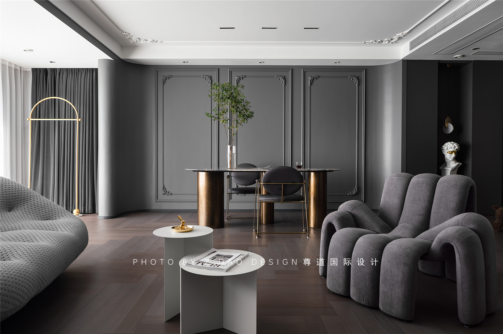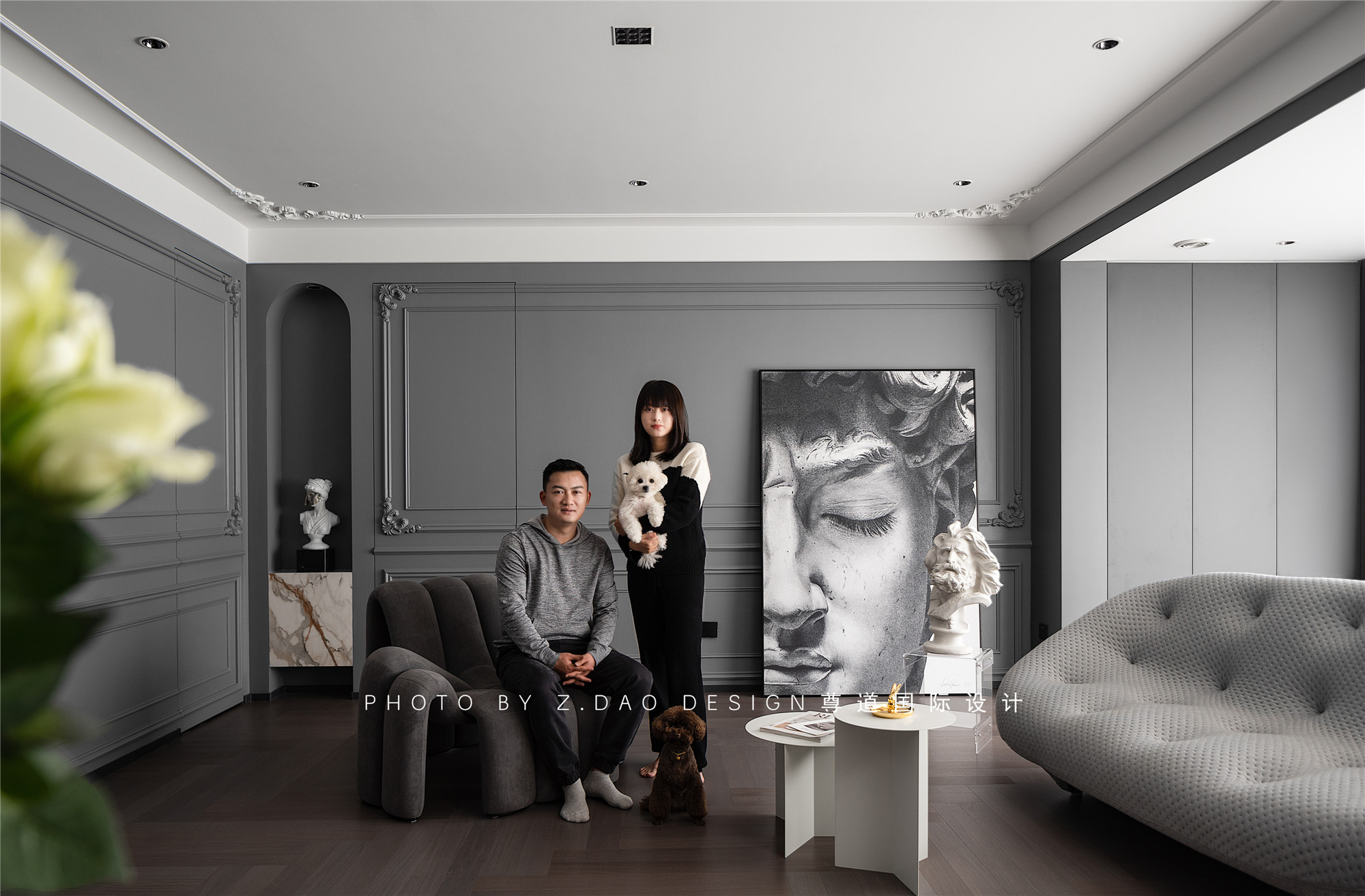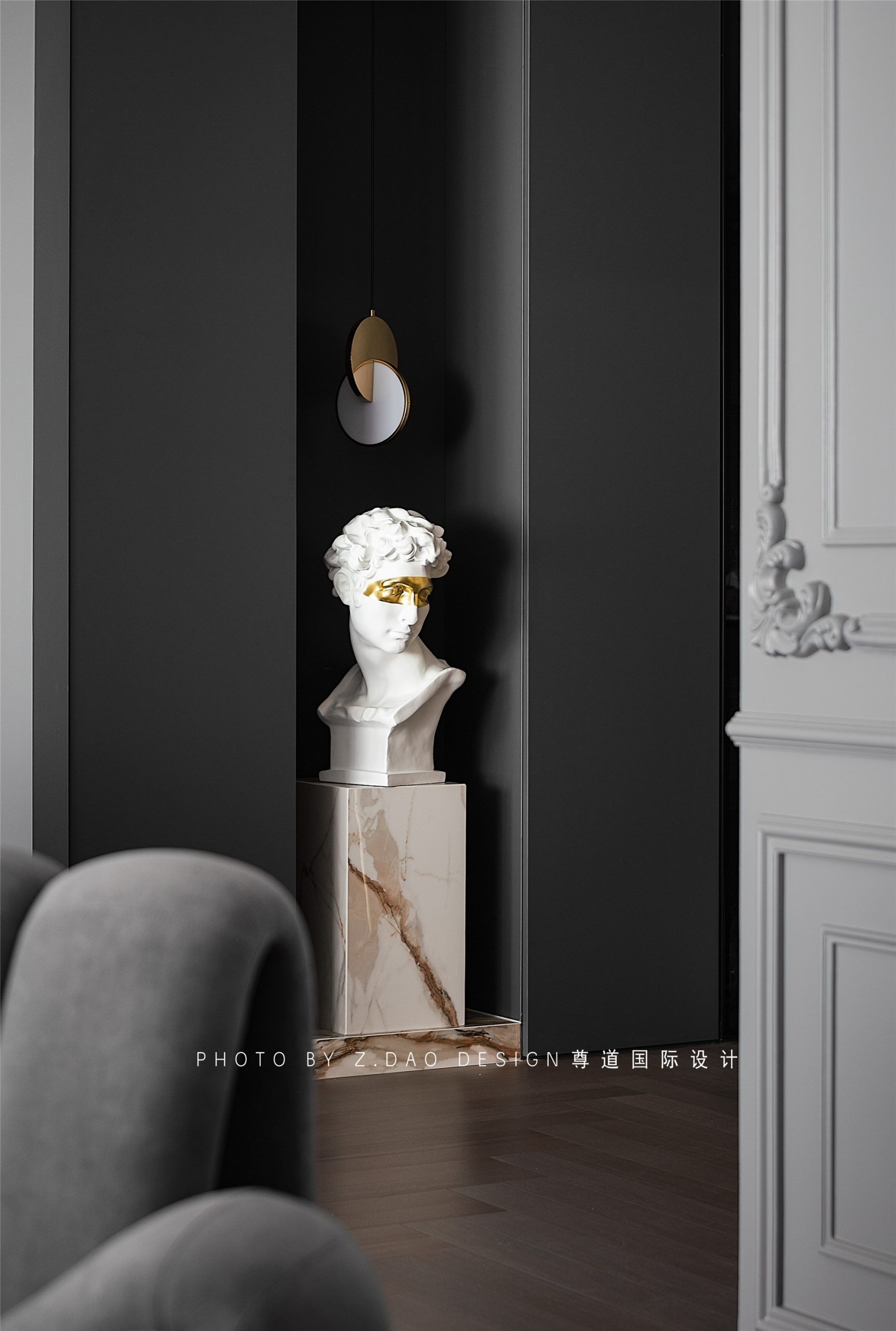 水泥灰墙面、沙发、装饰画与雕塑、茶几混搭,形成明暗对比制造戏剧化的张力,让空间充满故事性,赋予法式风格更加时尚的基调。