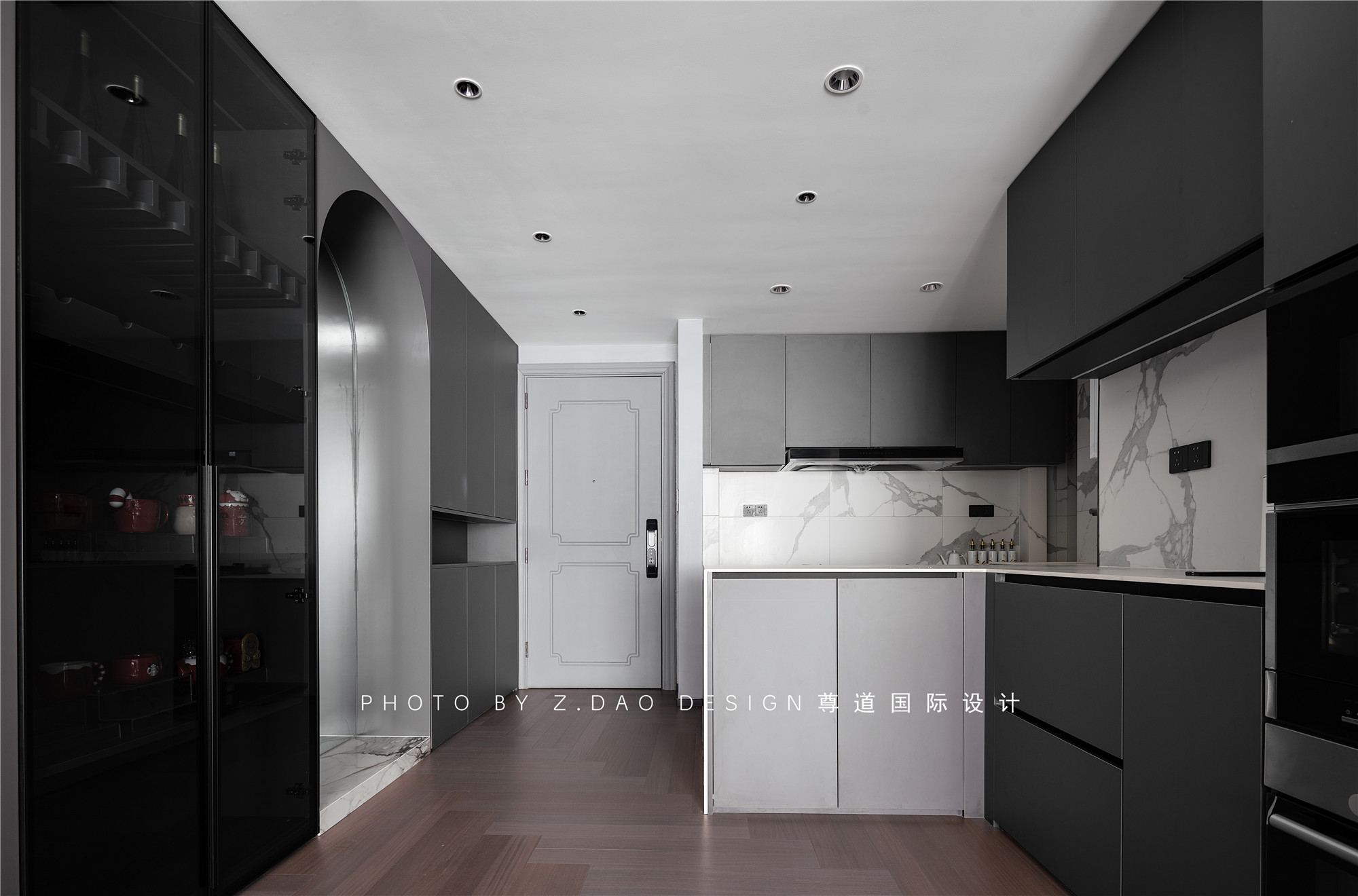 运用材料:仿铜色不锈钢板、黑白根大理石、鱼肚白岩板、烤漆门板、格栅板、艺术涂料、意式玻璃门等。