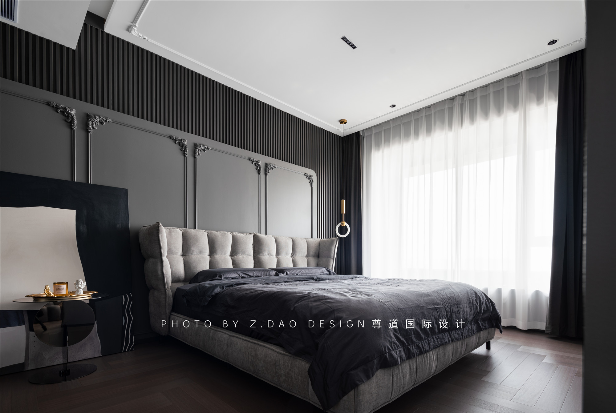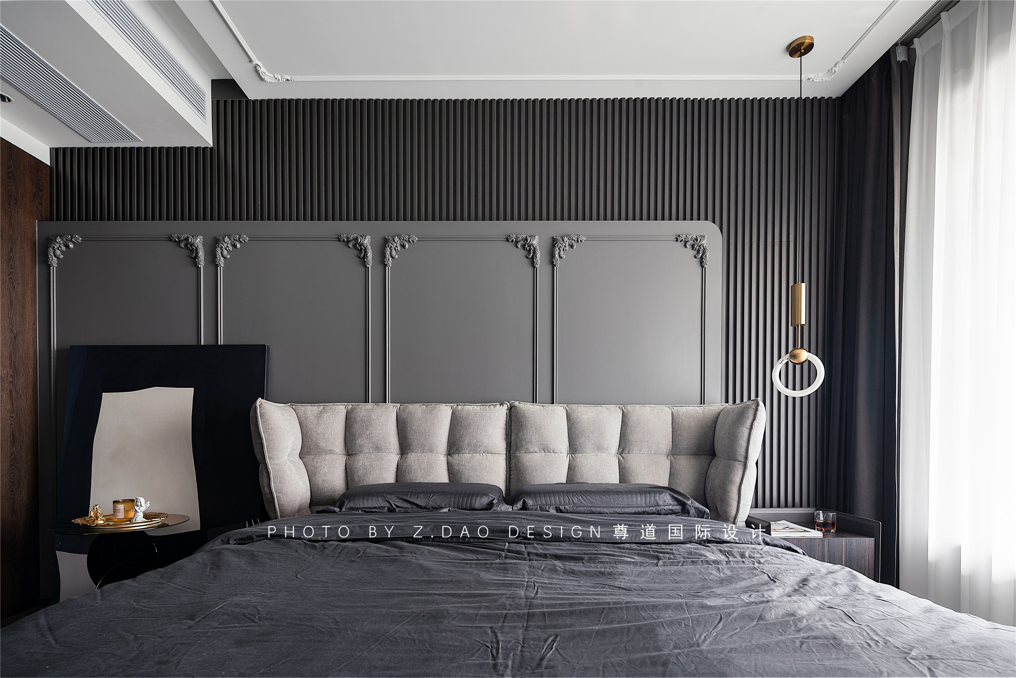 主卧室用了深色系,法式线条搭配格栅板这也是一种混搭的美,无主灯的设计是整个空间的灵魂所在,灯光的美感也是空间材质和色彩的体现。