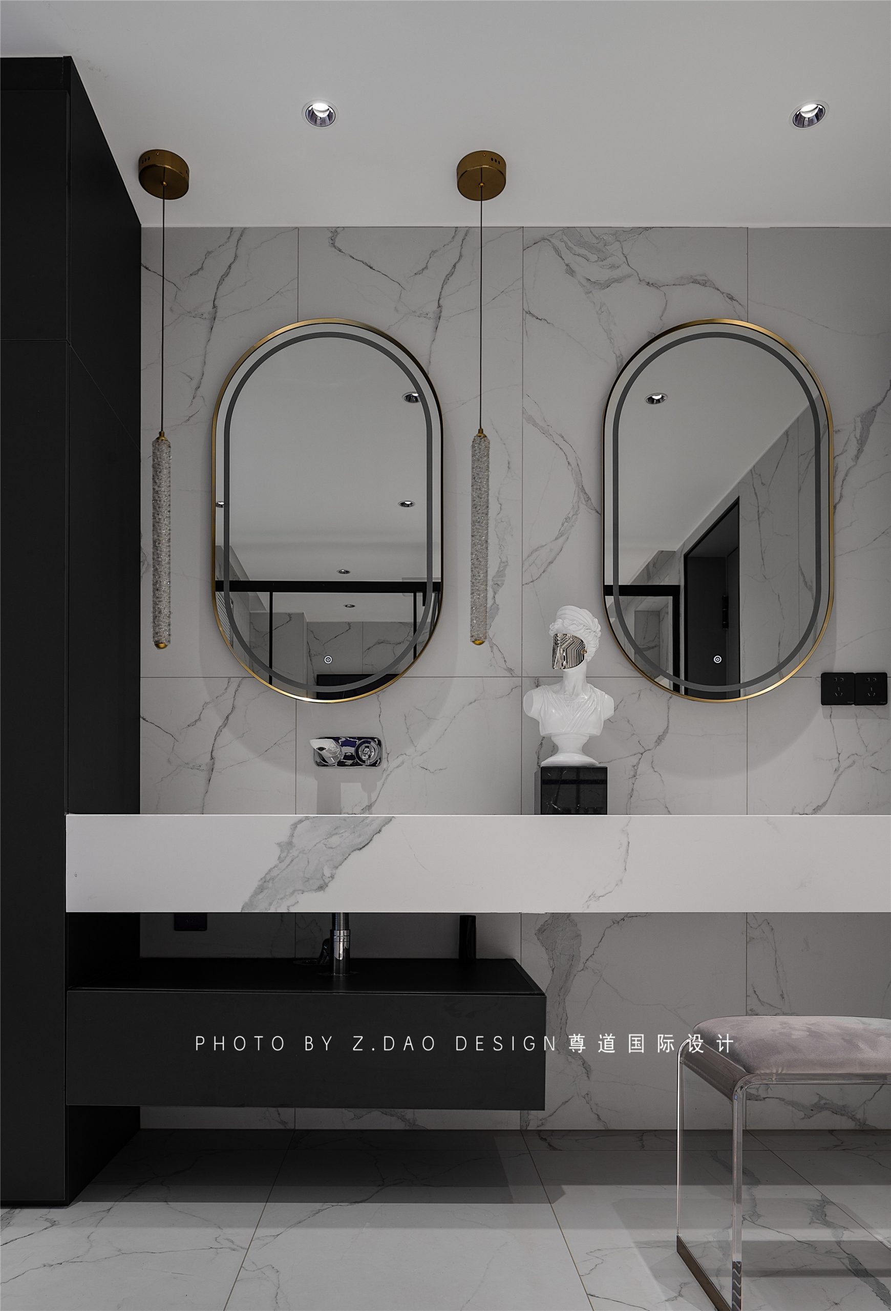 以白色为主色调,在视觉感知上,白色是比较柔和、干净的色调,而黑色和金属色,则兼具知性与时尚的特征,二者结合,使空间调性在和谐统一的基础上更加具有层次感。