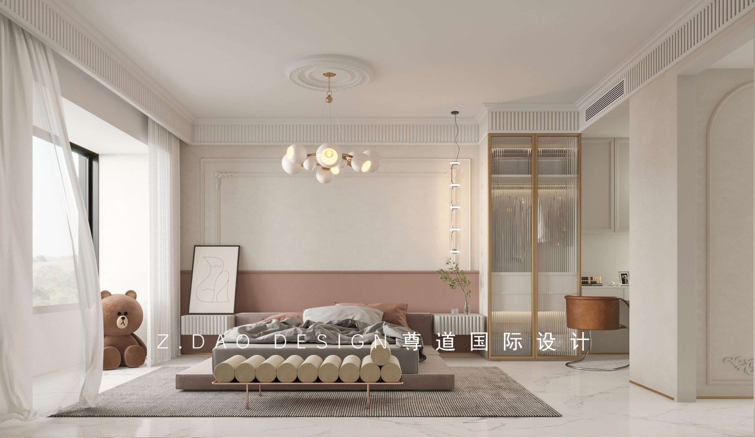 主卧区域墙顶面采用大面积的艺术漆,让空间更加有层次。背景墙的颜色选择了豆沙色,床头的吊顶灯自由地垂坠下来,多种光源的自由组合满足了屋主的需求。
