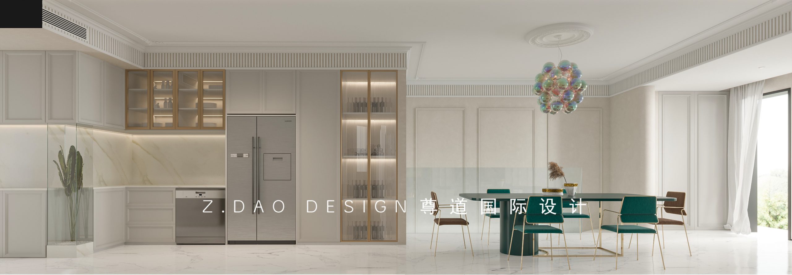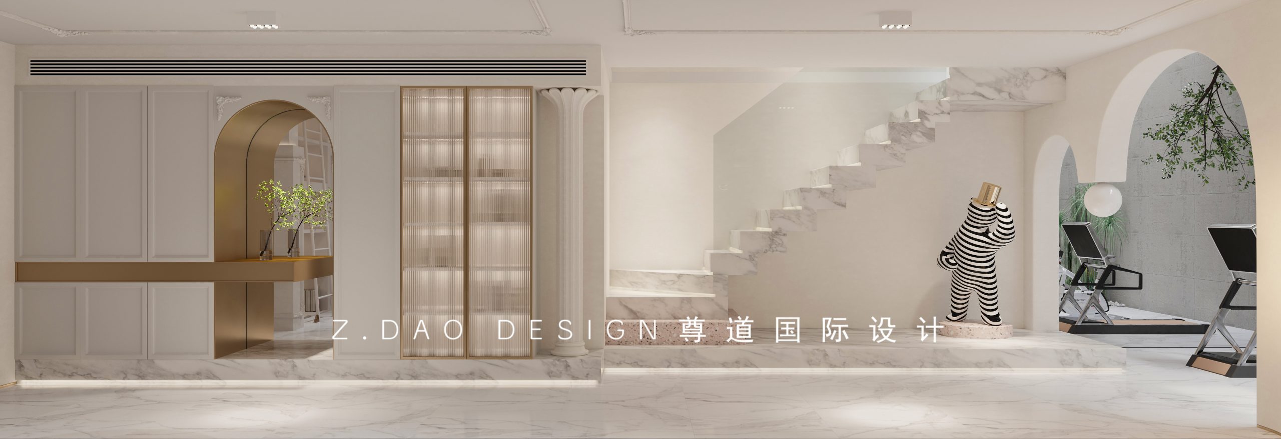 同样采用了拱形门洞加金属包边的设计手法,满足储物的同时也满足了设计感,金属门框的长虹玻璃门内设灯带,增强整体氛围。