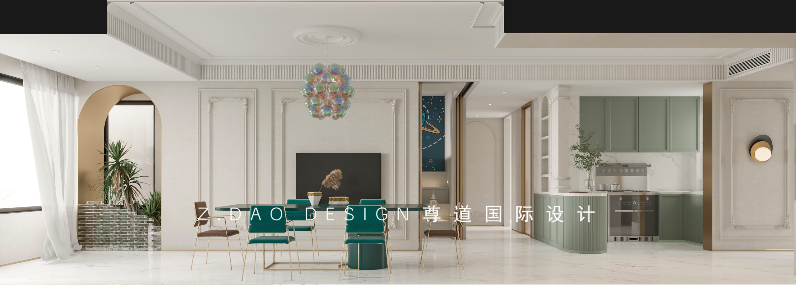 厨房区域则采用墨绿色门板,小清新的视觉冲击感尽收眼底;阳台区域原有空调外机扩入室内设计景观区,弧形门洞金属包边、玻璃砖高低错落排列,里面种植绿植让户外院子与室内景观相通,人与自然和谐。