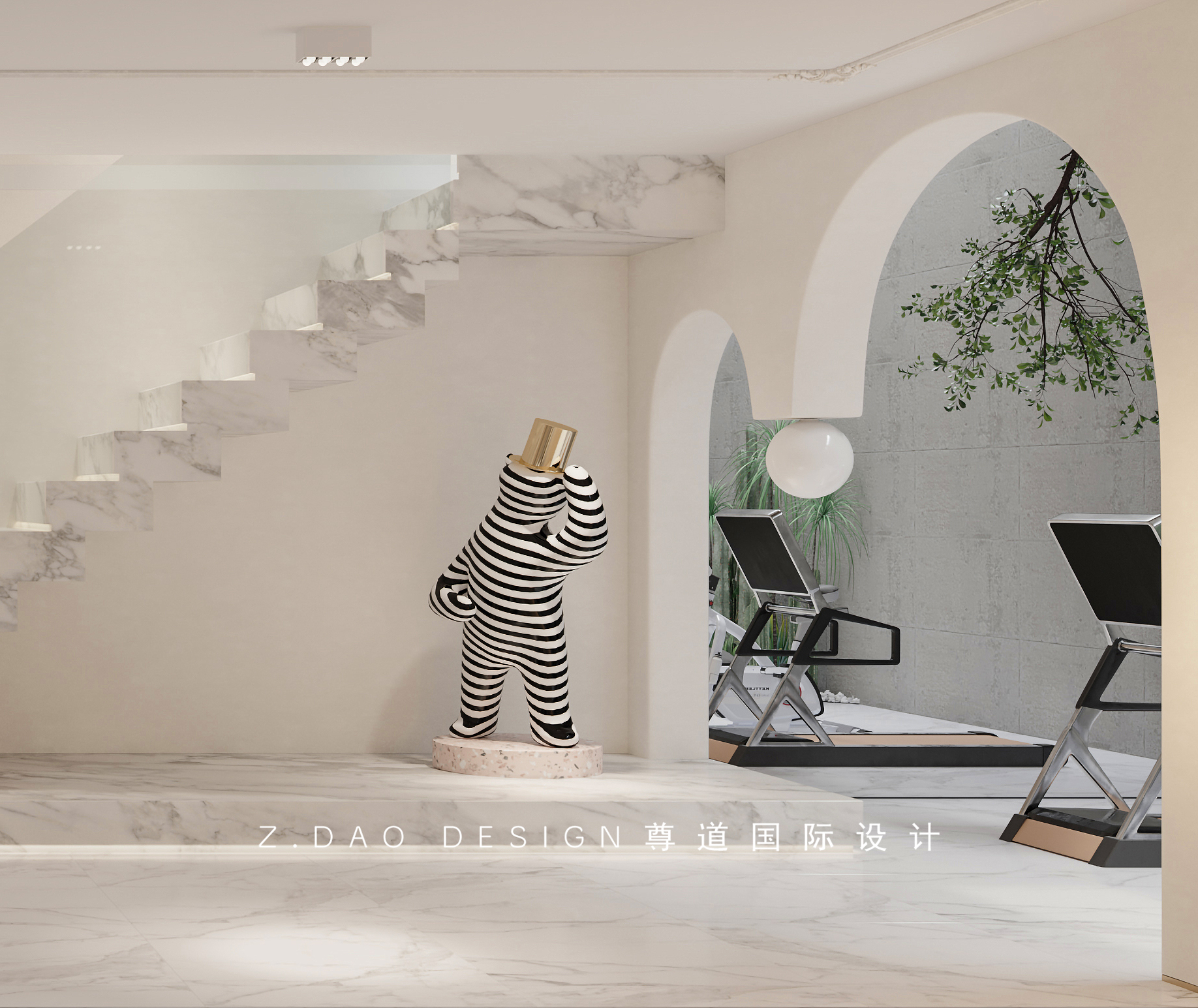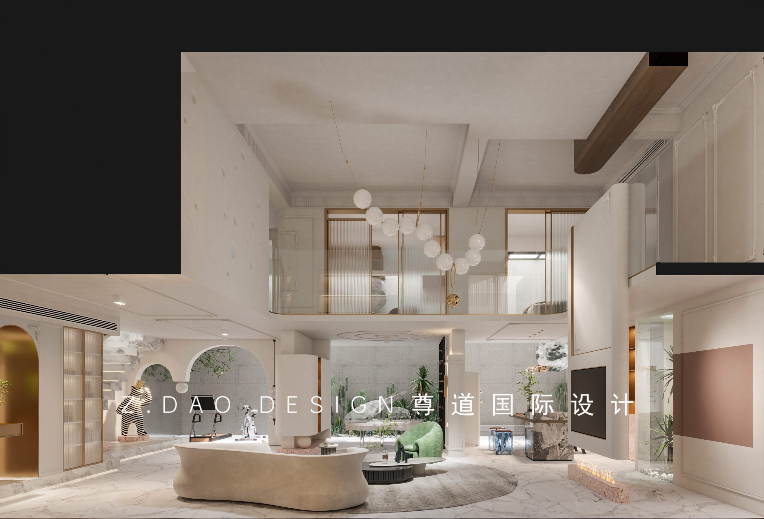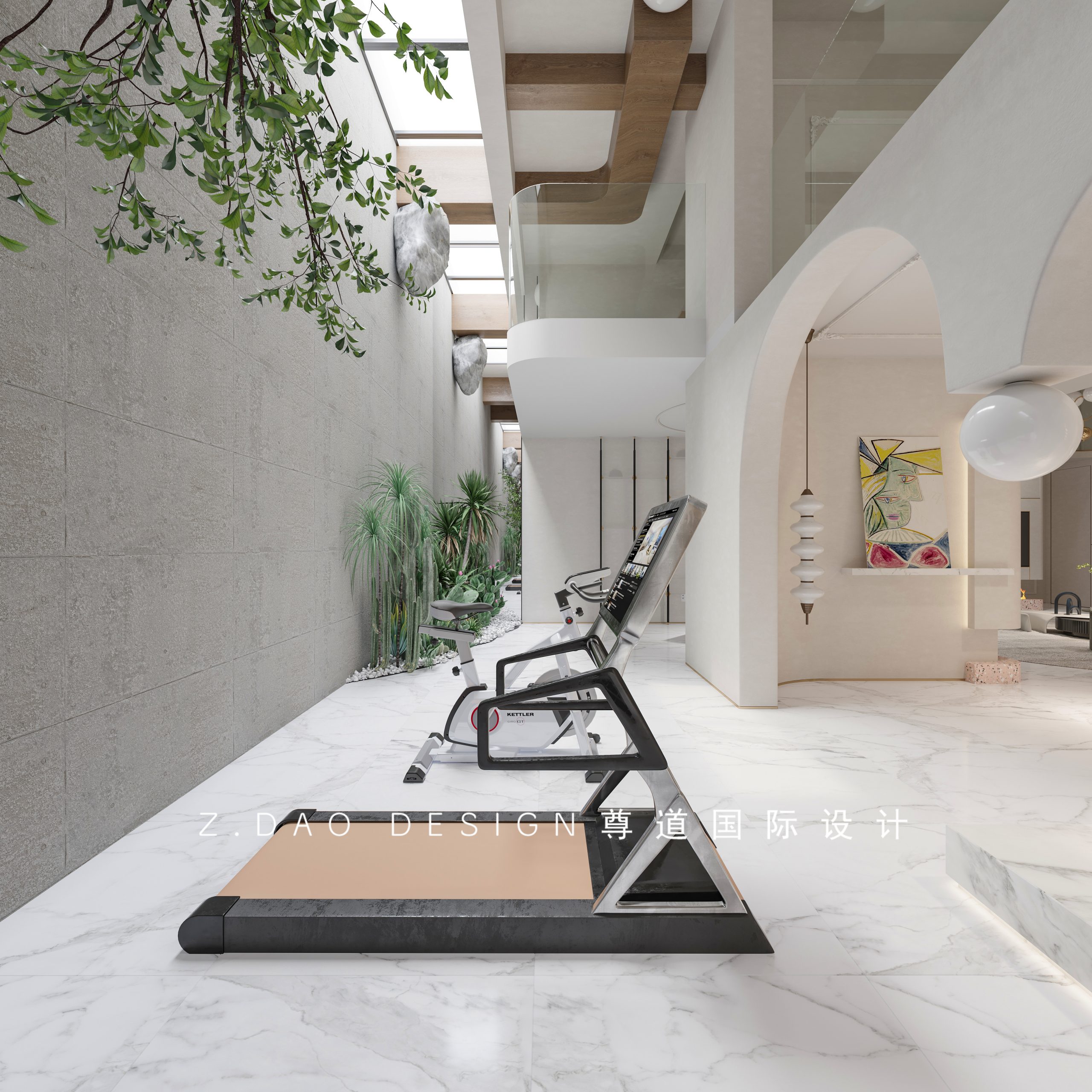 负一有三大亮点,第一个就是运动区,大小拱门造型,两拱门之间挂有球形灯整个造型就比较新颖。后面倒挂树景的设计就很是细节。