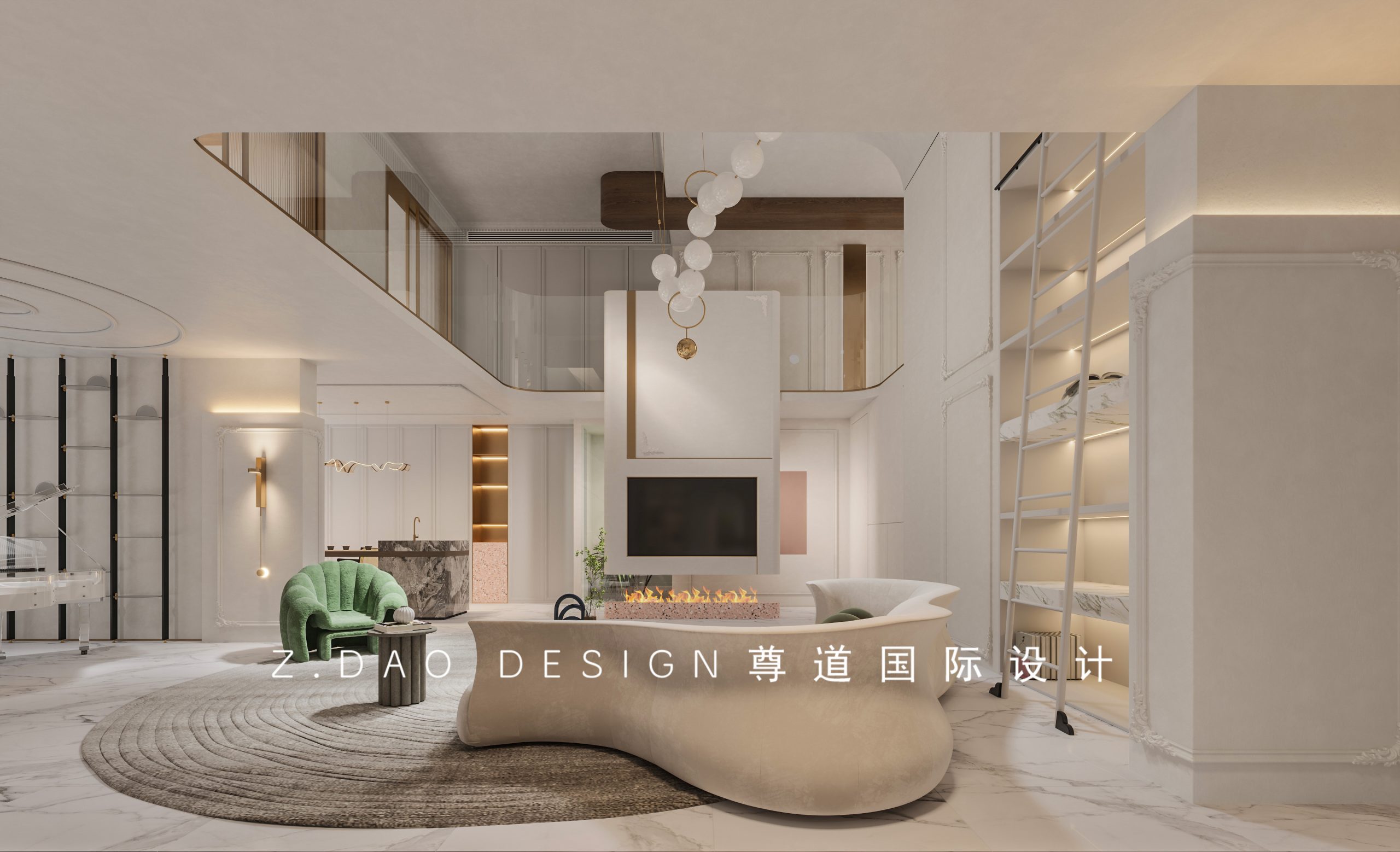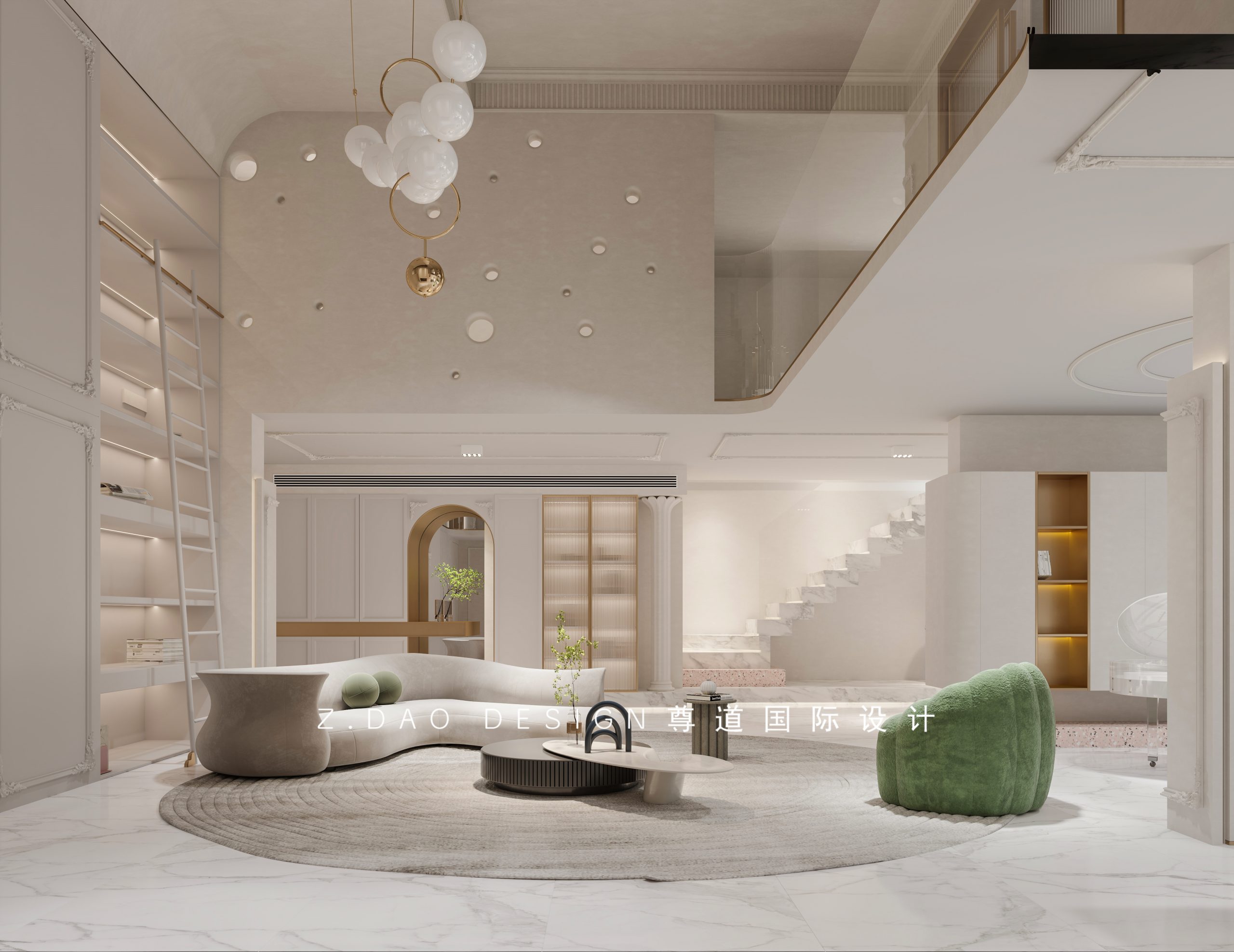 环抱式的弧形沙发搭配墨绿色的单椅,让整个空间看起来更加灵活,整体以白色为主调,设计师主旨在于打造安宁、静谧的空间氛围。白色的主色调搭配一丝丝拉丝铜金色,惊艳但不饱满,给予建筑本身一份天然的发挥空间,放大建筑本身的优势;