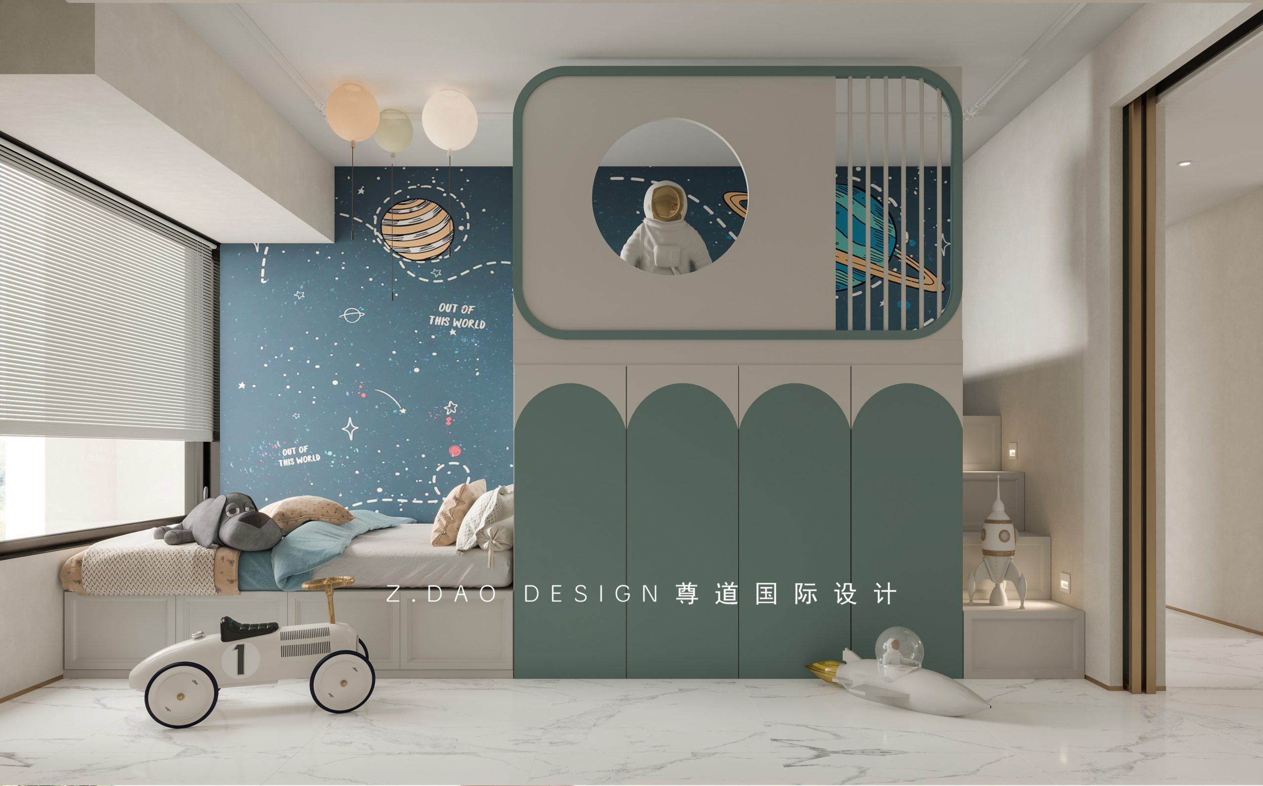 儿童房区域拆除了原有飘窗位置,增大了室内使用空间,设计高低铺,太空主题的背景墙,卧室的一组高柜将两个床体分割开来,踏步同样也植入了收纳系统,边上内嵌了感应灯,满满的氛围感,金属边框的玻璃移门将室外与室内的空间进行划分;顶面只是简单的用PU线条走圈加上艺术漆的涂刷,虽然简单但是却恰到好处。