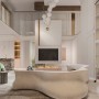 圆角的悬浮柜子不仅弱化了碍事承重墙的,又美化了空间。