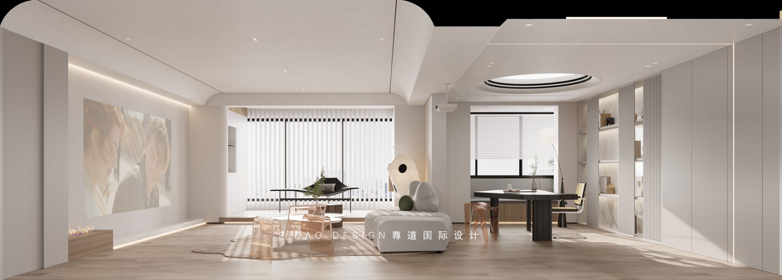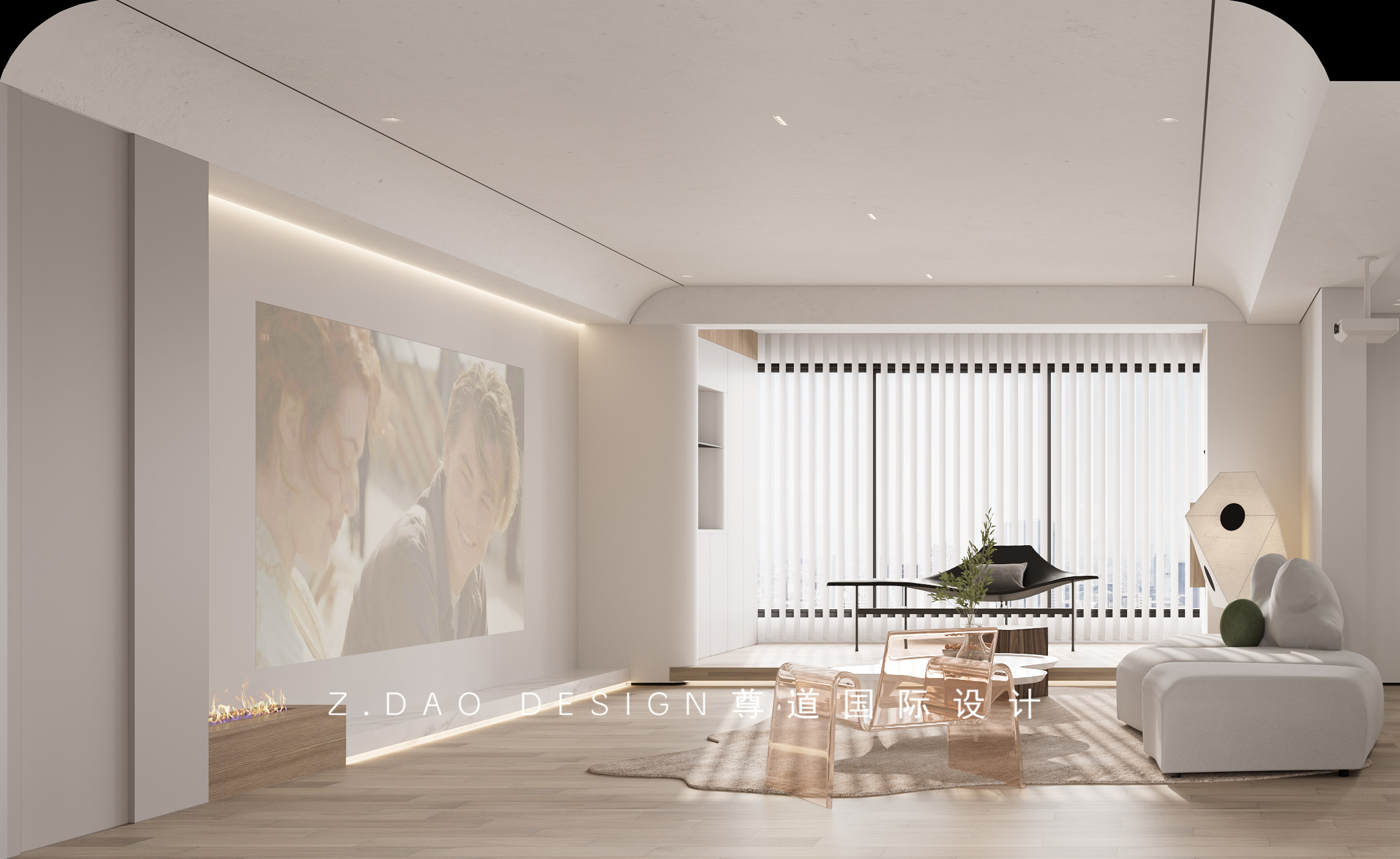 客厅利用白墙做投影,满足日常观影娱乐需求,这样的设计也会让空间看起来更宽敞利落,配合整体的吊顶造型以及灯光的衬托更显品质。