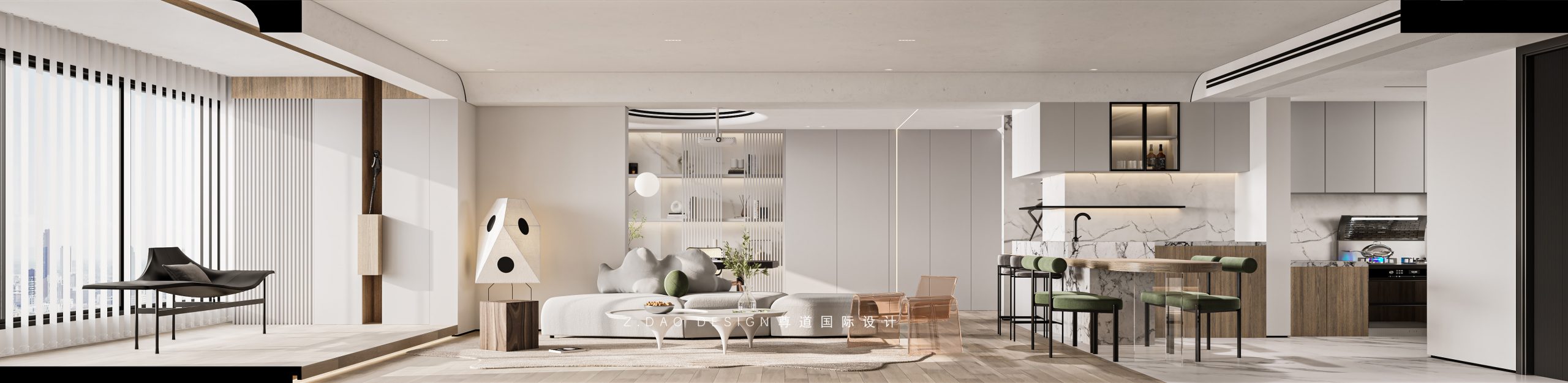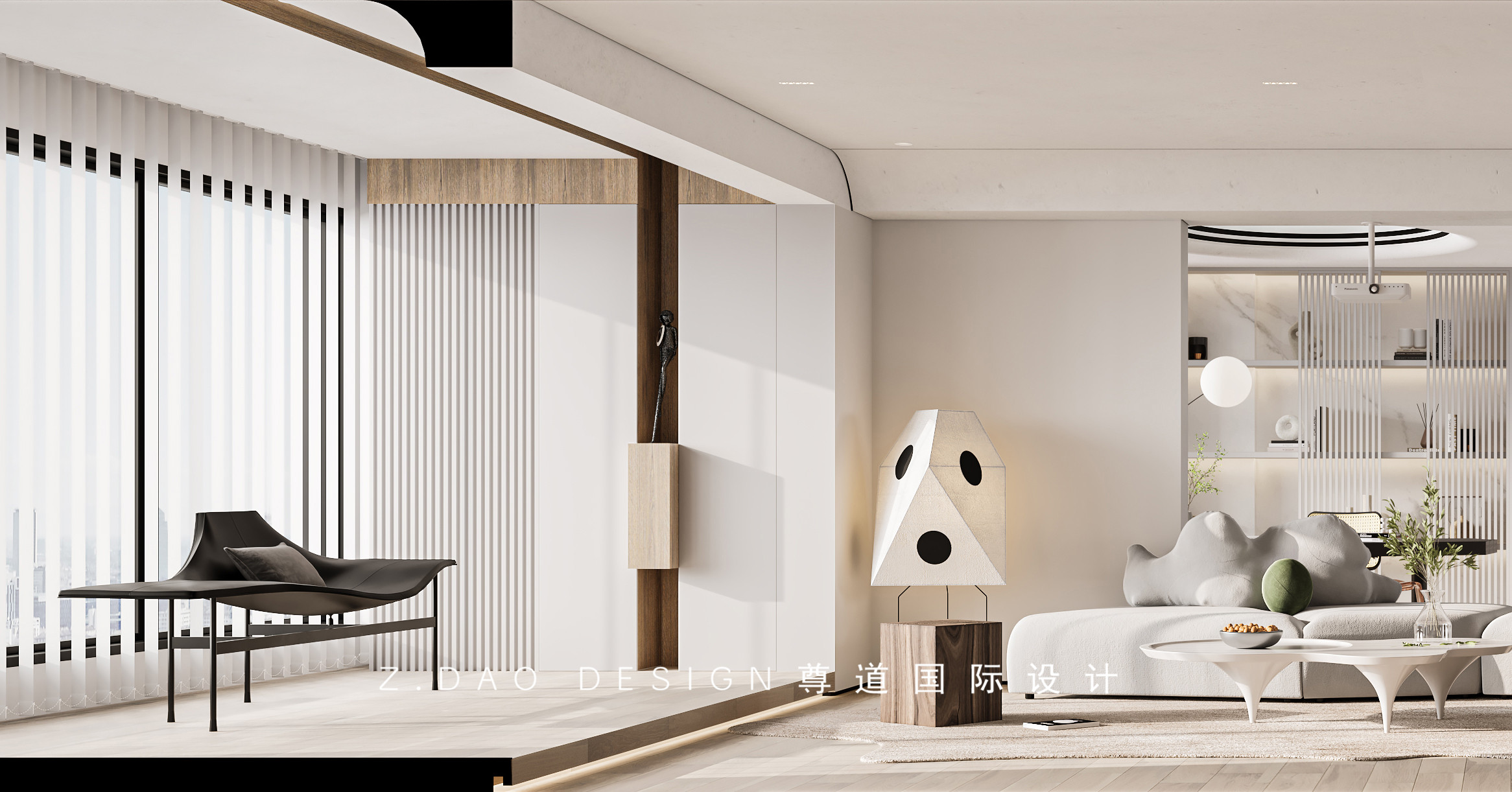 阳台抬高十公分,下方安装灯带,温润的木质包裹了整个台面,打造成“多功能地台”。采用大面积落地窗,使客厅采光充足、沉静、柔和提升了空间舒适感。白色肤感木饰面和同色格栅搭配打造一方休憩与会客的艺术港湾。