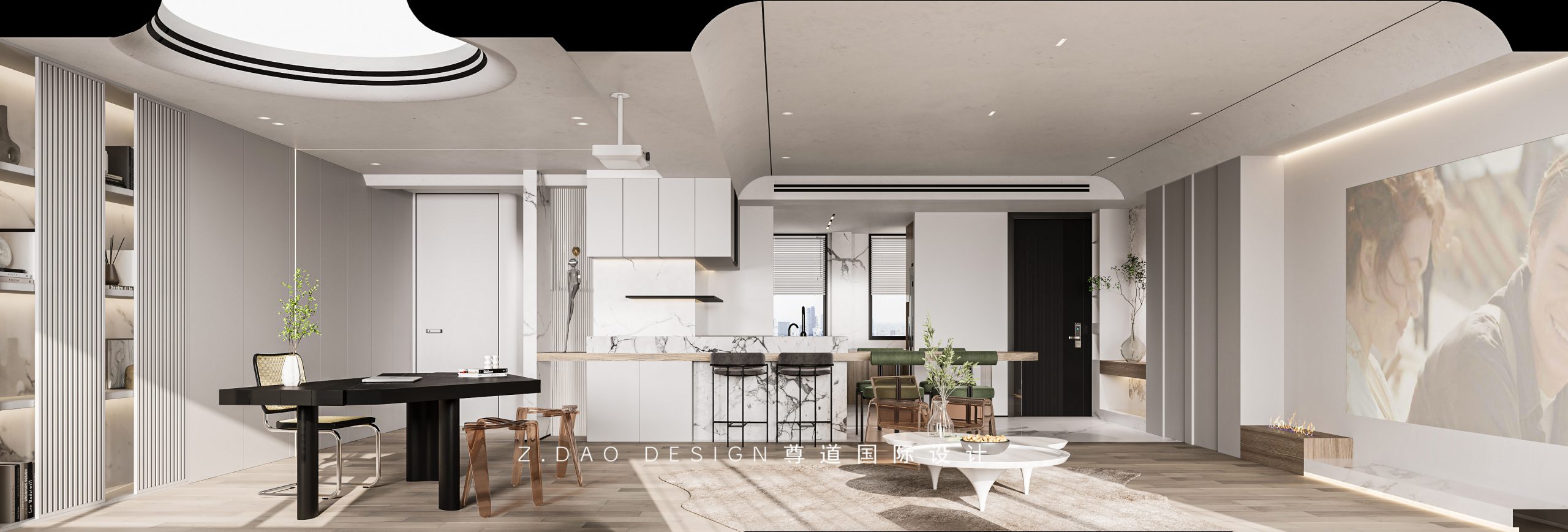 客厅是整个房屋的主要部分,在入户就利用了客餐厅的方形在吊顶的设计上采用双边弧形做顶面规划,让空间更具柔和感,也让客厅有了被包围的感觉,纵向的矩形和内凹弧配合书房的圆形吊顶,再加上充满科技感的艺术线灯 ,在这儿离点线面的空间内,有了圆、有了方。