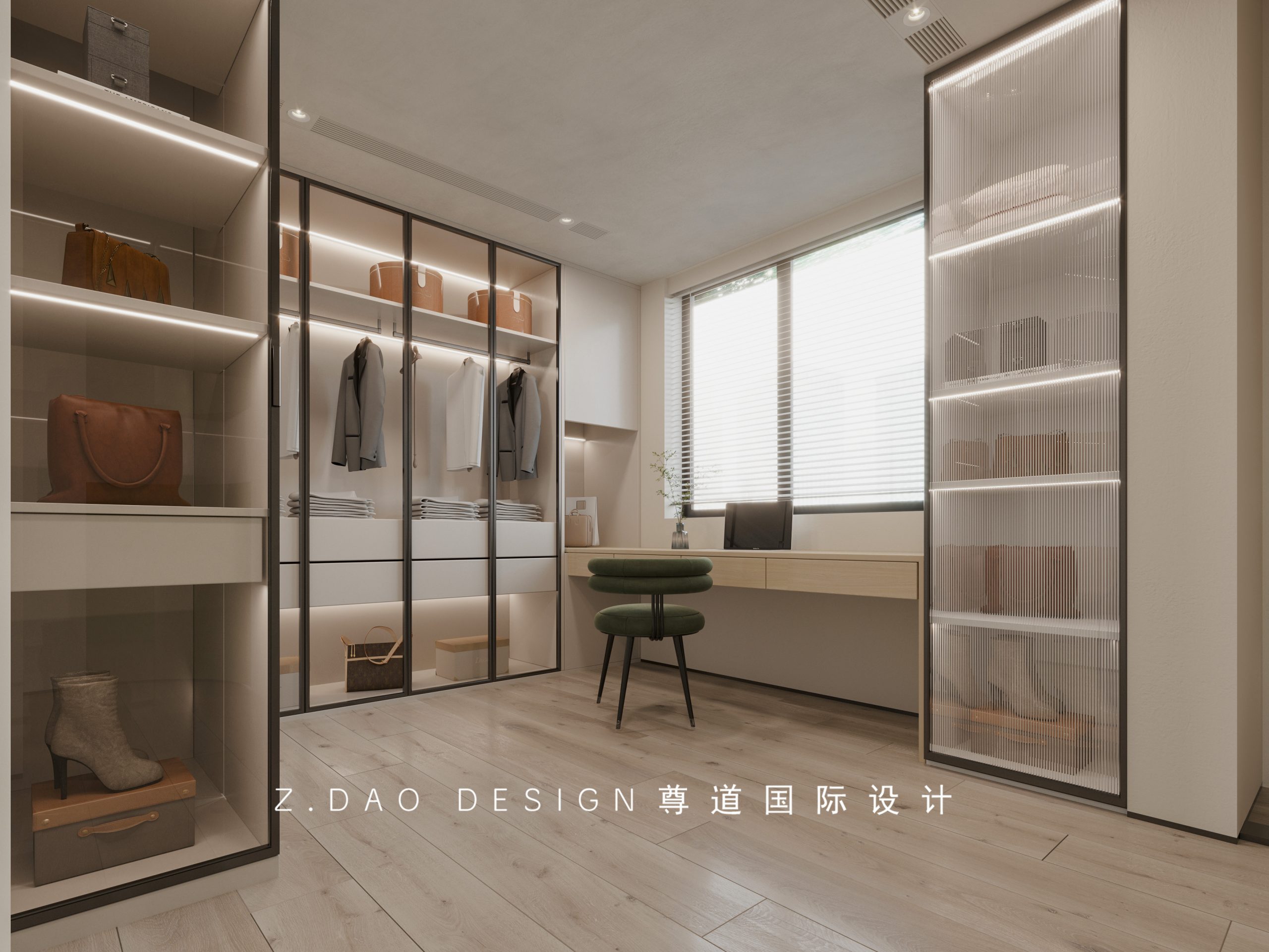 开放式衣帽间和主卧同款木地板通铺,视觉上更加宽敞,敞开式的设计,保证空间的通透性,按照主人生活收纳习惯定制梳妆台、悬挂区、叠放区、放包区、饰品区和鞋子区,让每件物品都能更好的收纳,保持空间的整洁。