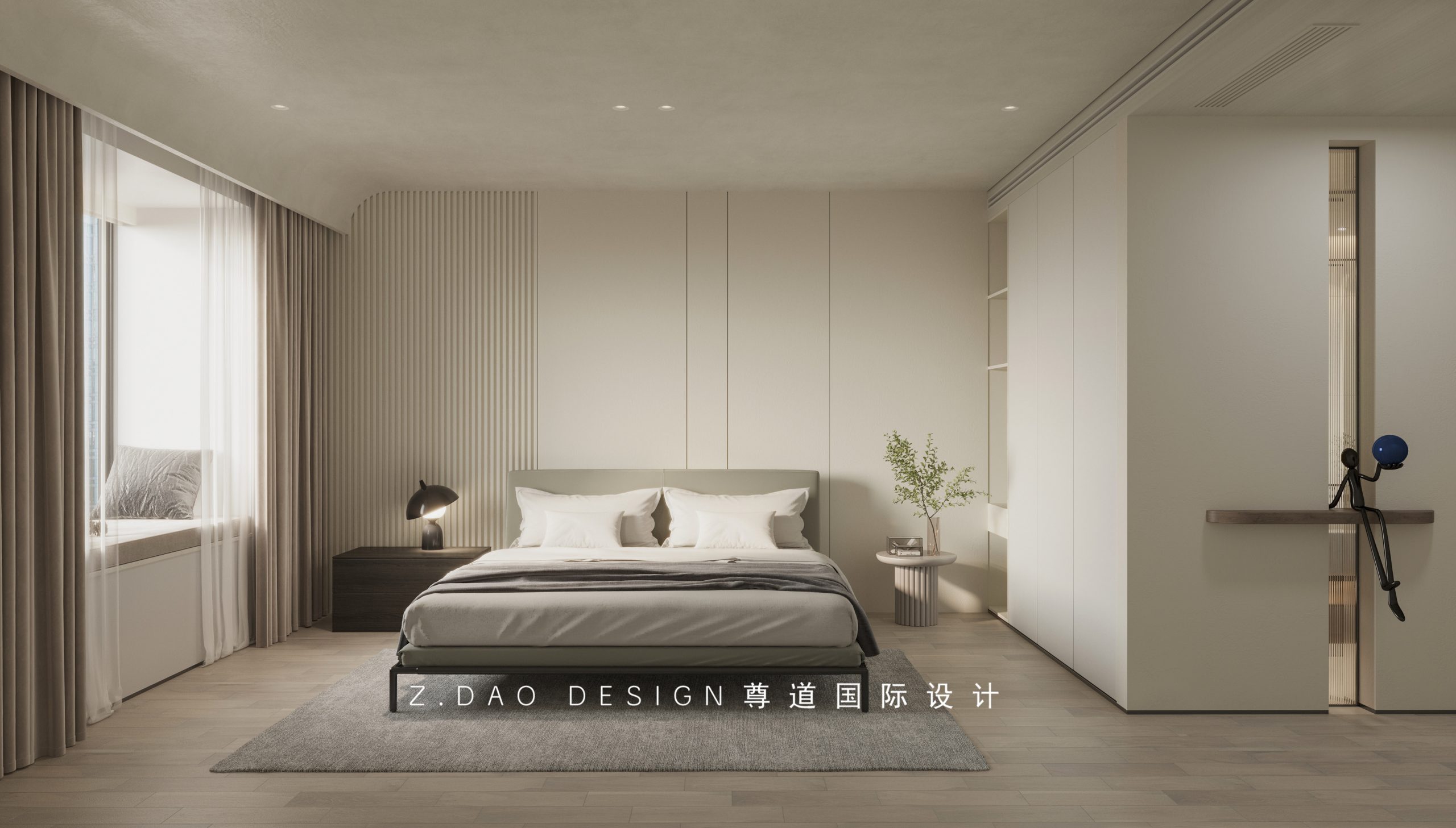 主卧室的背景墙中,留白一部分加入格栅造型进行点缀,软装的配饰简约并不简单,浅色的乳胶漆加栅格木饰面,简约大气又耐看,顶面也采用了无主灯的处理,让空间的灯光更加有层次感。