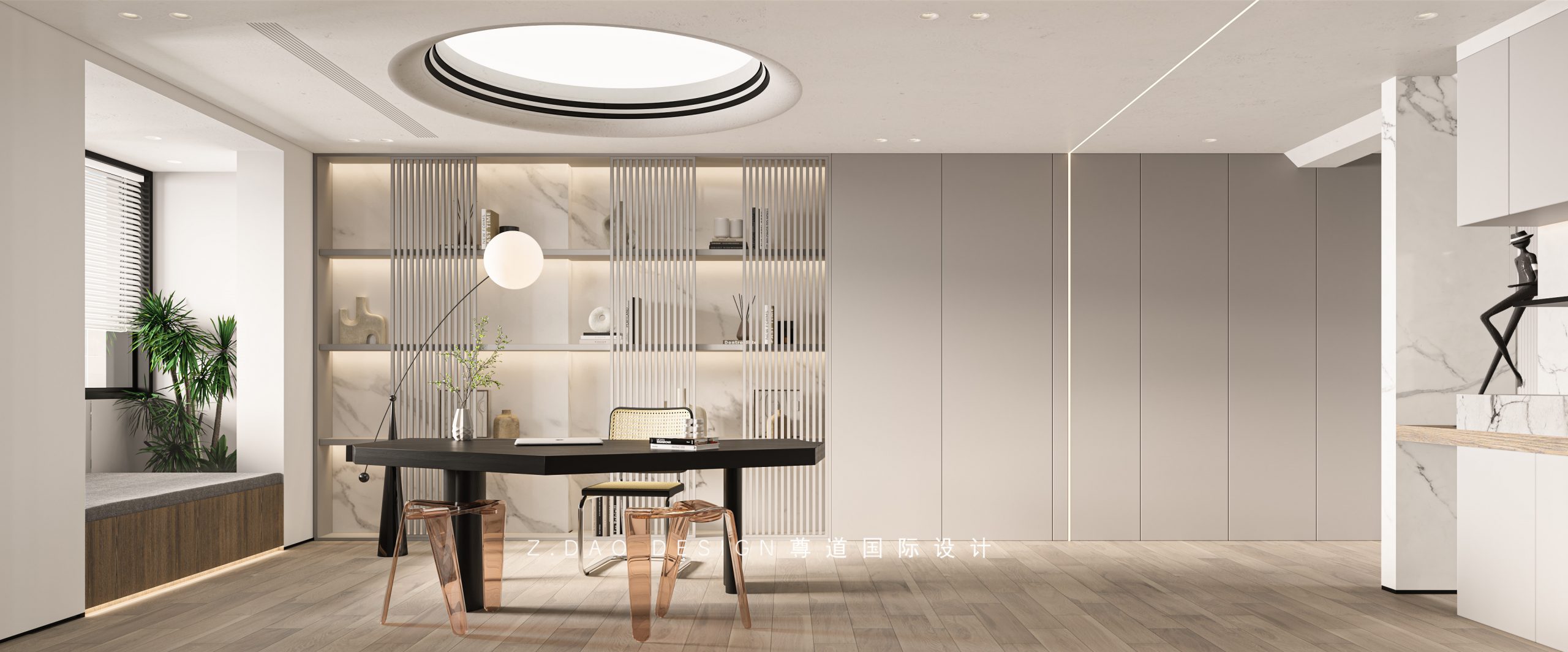 书房顶面采用了“天圆地方”的设计手法,顶面的“圆”覆盖一层光膜,弱化了亮度,柔和了光线,看书办公,比射灯均匀,也模拟了天窗的感觉,极简风书房强调了纯粹与安静的书房氛围,简约的线条与干净的色调,利用灯光膜营造出一个足以静心的空间。
