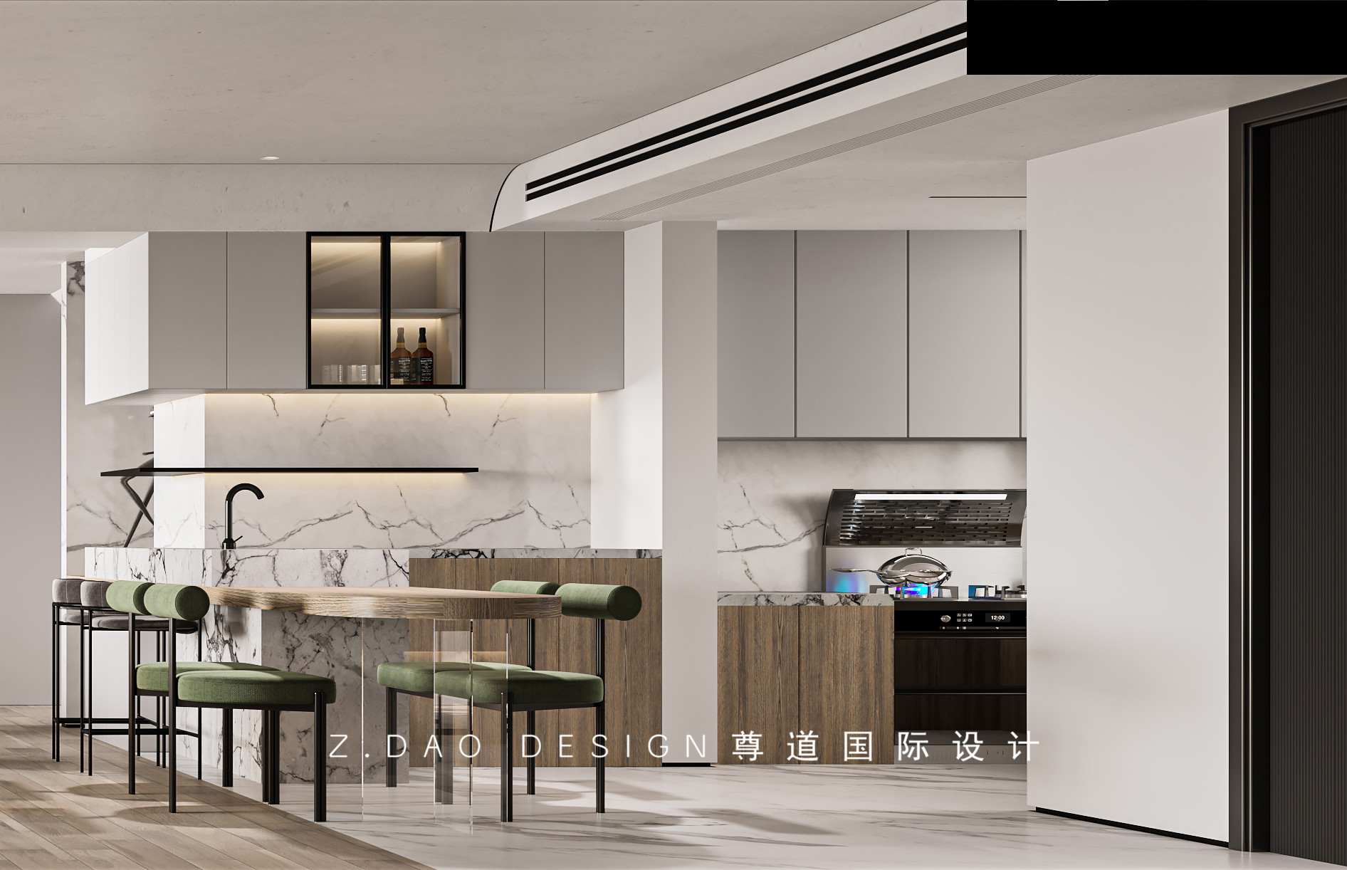 餐桌嵌入大理石纹路的中岛台,既美观又整洁,增加水槽设计,隐形柜体,方便实用。