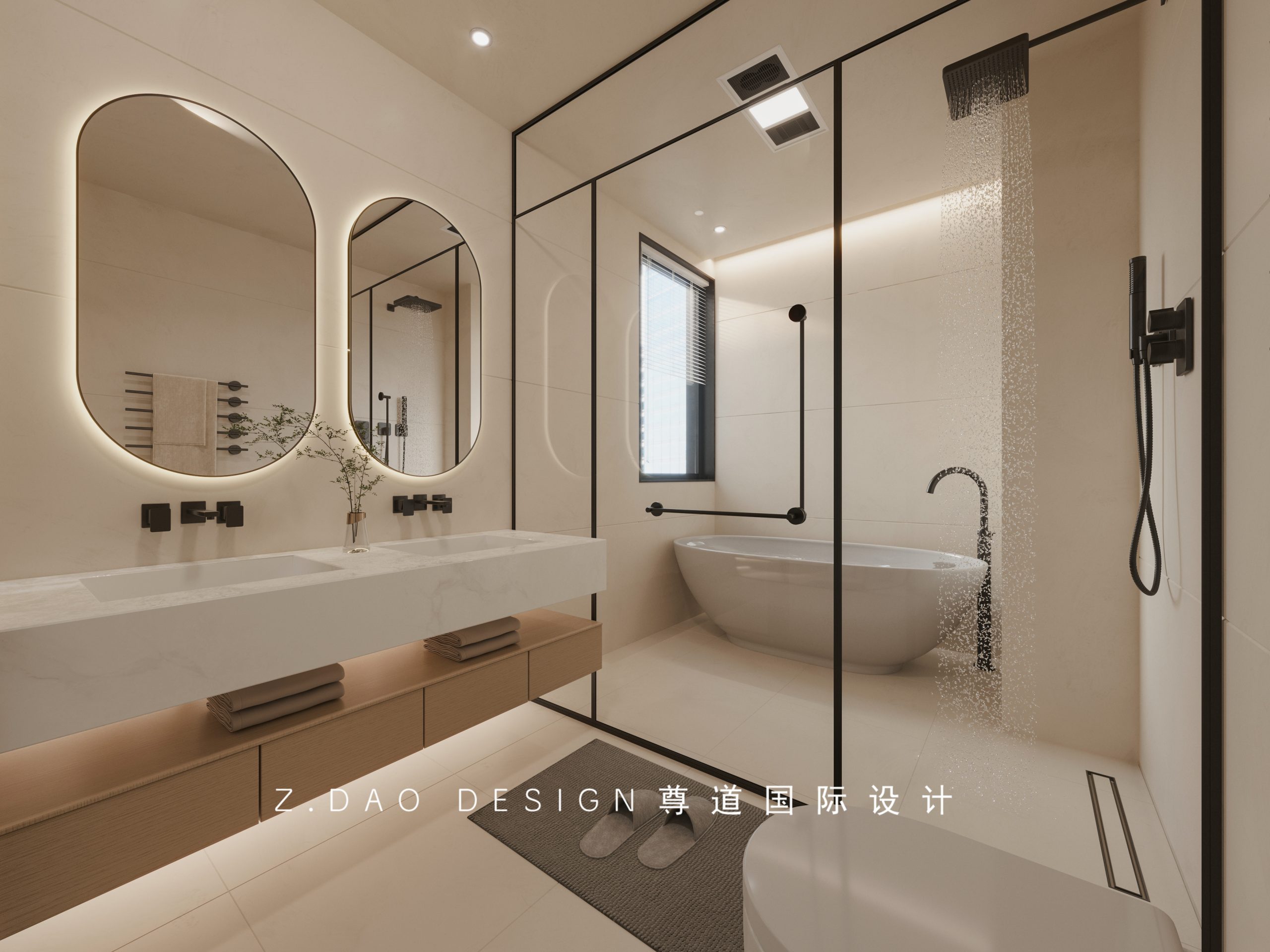 主卫的吊顶用防潮石膏板做了无主灯的设计,配上灯带,满满的高级感。浴室柜做成整体悬浮的形式,方便打扫卫生的同时也更加美观。浴缸放置在窗户的位置,不占用空间。