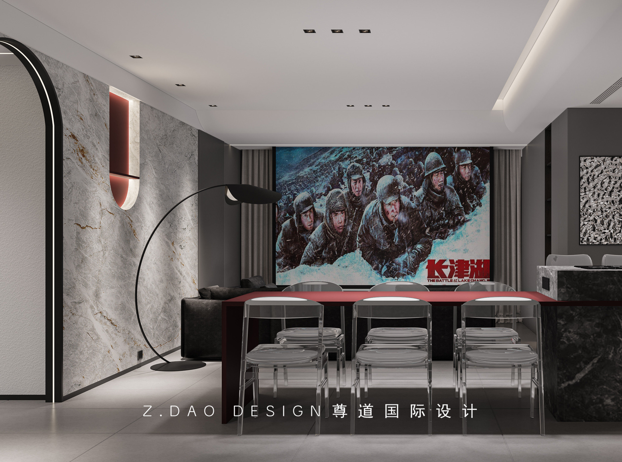 餐厅的餐岛台采用大理石和红色木板作为主体材料,通过穿插的设计手法延伸桌面,与岛台具有连接性。低调、素雅、接近自然,使整体的空间色调不单调,平滑过渡了客厅与卧室之间的空间感。同时红色木板也与入户鞋帽柜来进行了色彩呼应。让两个不同功能空间之间有了联系。六人的餐桌满足一家四口的基本需求,也能满足家里来客时的座位需求,配上亚克力透色的餐桌椅,更能增加空间的通透感。