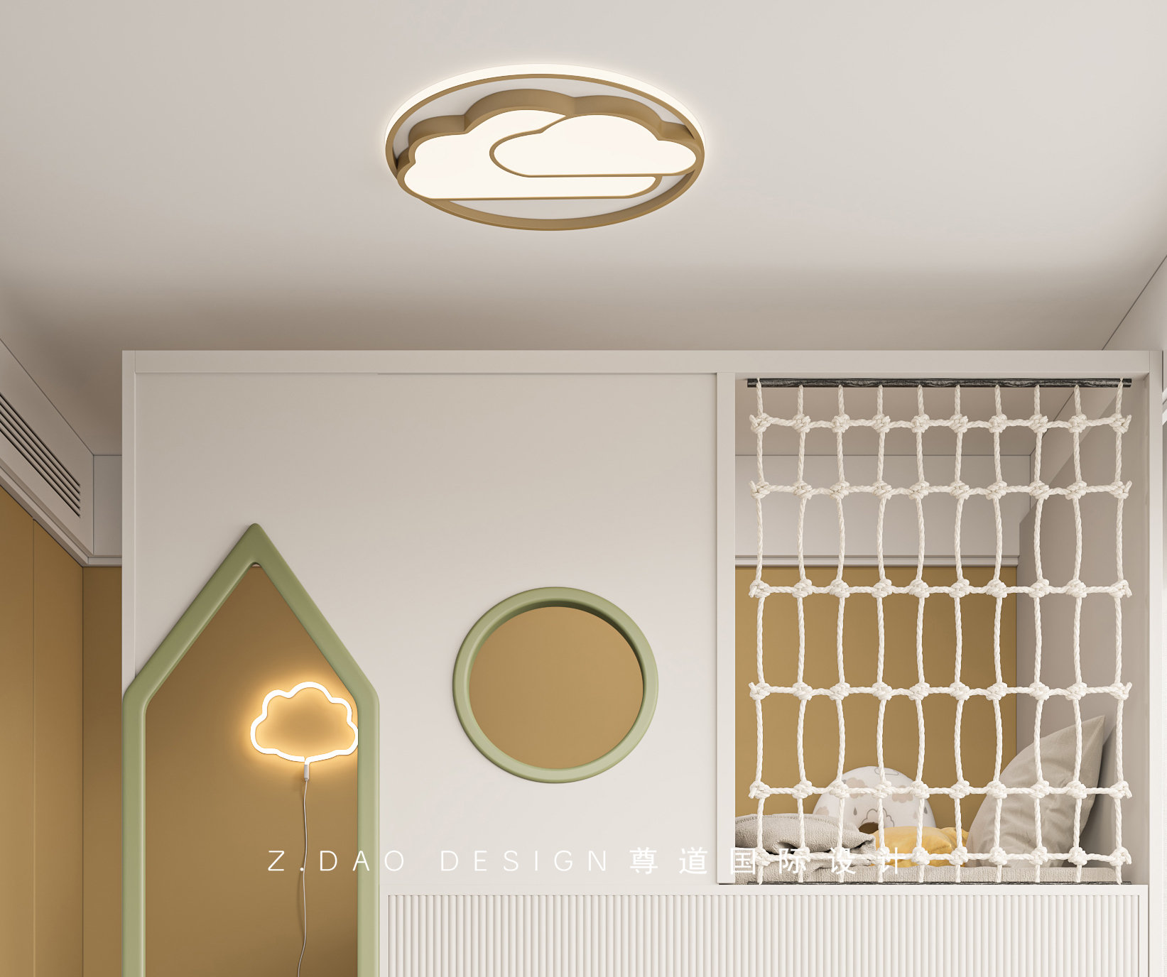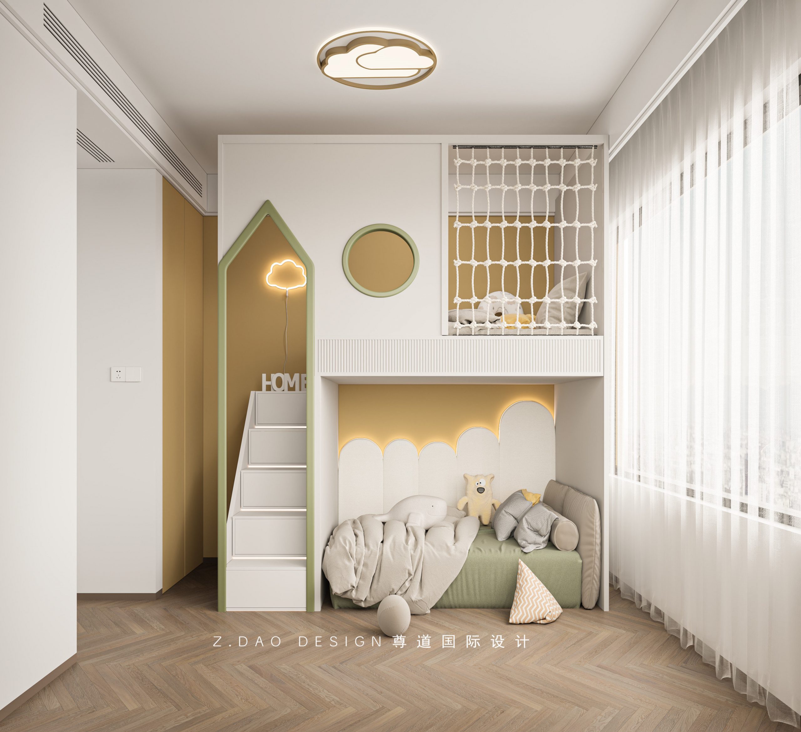小孩房用绿色和黄色的上下床为主题,与墙边柜子的黄色基调相呼应,整体空间看起来活泼朝气,床的屋形入口圆形眺窗以及网状护栏都迎合了小孩探索世界的好奇心,房间的温馨感油然而生。床的背景墙暗藏云型灯光,增添贴近大自然的感觉,给小孩一种安全感与舒适感。旁边大窗户毫无遮拦为小孩房带来足够的光线。