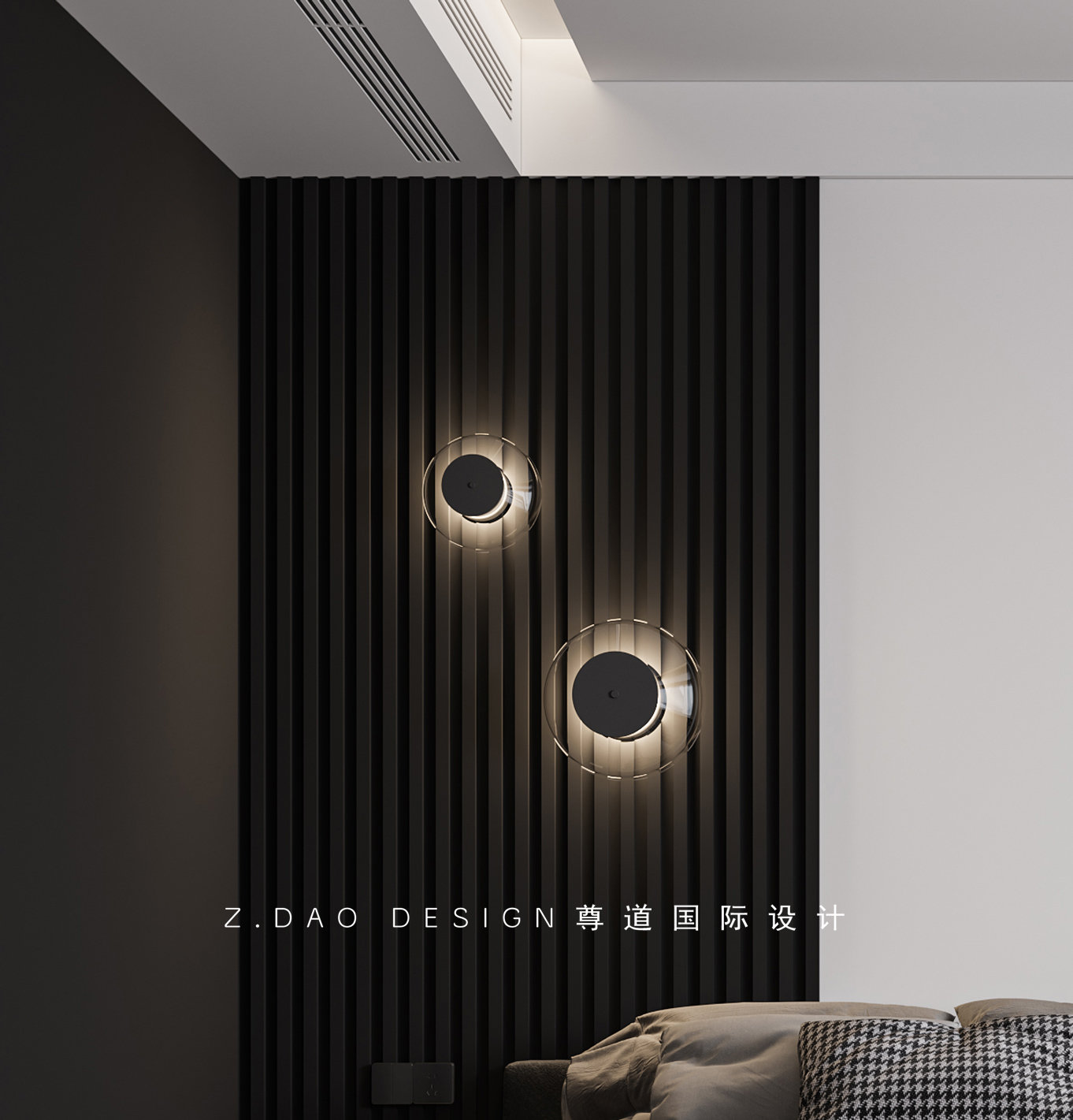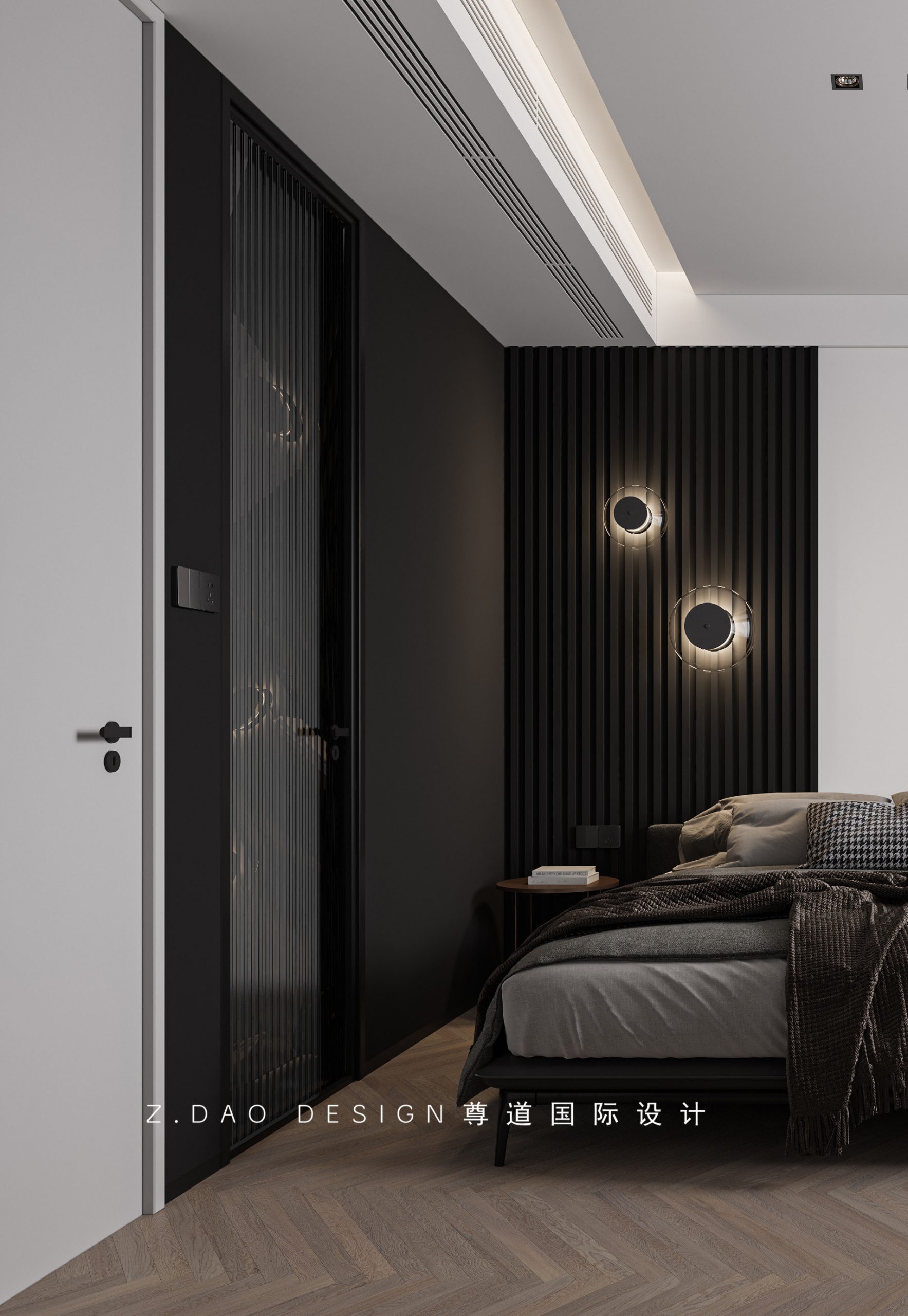 卧室门的超高设计增加了竖向的纵深感,不至于过门时有压抑感,地面采用人字拼木地板。吊顶用双层石膏板弧形吊顶,增加房间的层次感。中央空调进出风口的加长也是纵深美的一种体现。