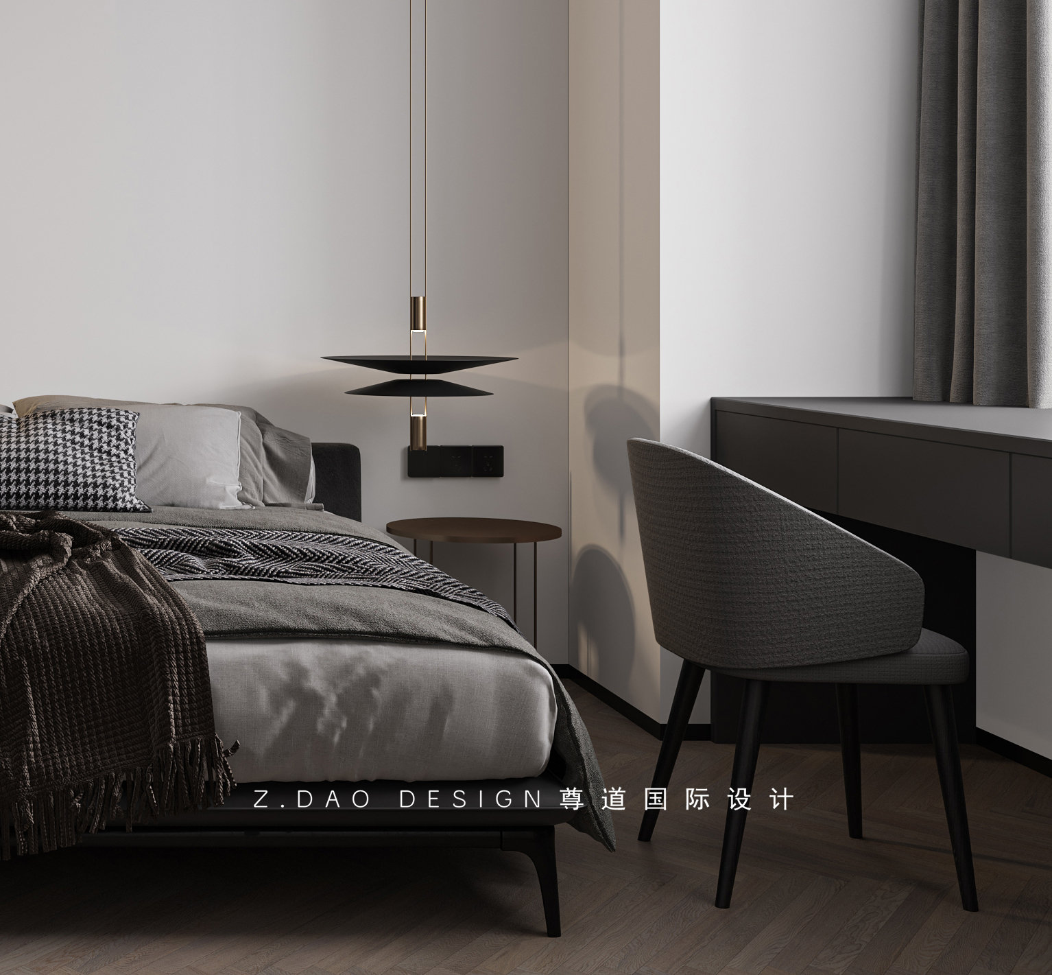 主卧室用黑白色的色调作为主体,窗边的置办书桌椅子,工作休息闲暇之余可以眺望窗外美景缓解眼部疲劳。床头背景墙采用白色乳胶漆加上黑色栅格,做的简单大气,经久耐看。让房间气息显得稳重。床头暖色吊灯为房间增添一抹温暖。