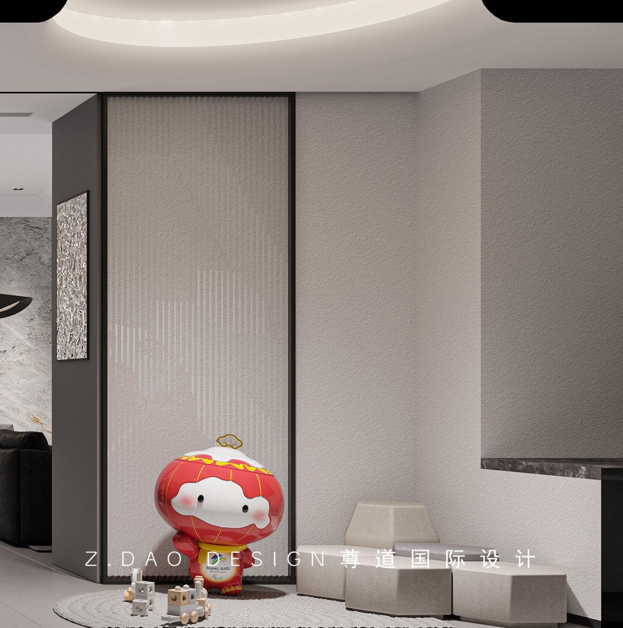 入户右侧布置了儿童玩耍区。玩耍区并没有摆放许多桌椅,一个圆形地毯便可以让儿童席地而坐。儿童天性本是无拘无束,一个玩偶陪伴便可,旁边一组柜体便可解决收纳问题。
