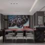 鞋帽柜入户即见,采用悬空柜体。改变以往通铺落地的单调。L型掏空加上木质横板穿插手法使的鞋帽柜体简单时尚以及更加的实用。添加红色色彩元素让整体空间不会非灰即白死气沉沉,为空间带来热情似火的活力点睛之笔。采用孔灯以及玩偶来迎接主人,让人劳累一天疲劳一扫而空,万家灯火总有一盏为你而留。