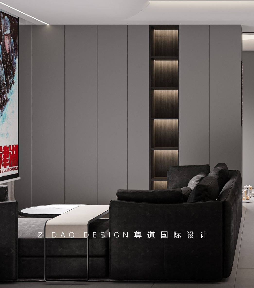 客厅弧形乳胶漆吊顶,暗装防眩光灯做法,侧边安置反光灯带,增加了空间光影的氛围感。客厅边柜一组开放柜台用来展放收藏品,其余采用封闭柜体用来隐藏小物件,便于打理。不会因此在客厅休息看见小物件杂和乱来影响宝贵休息时间心情。