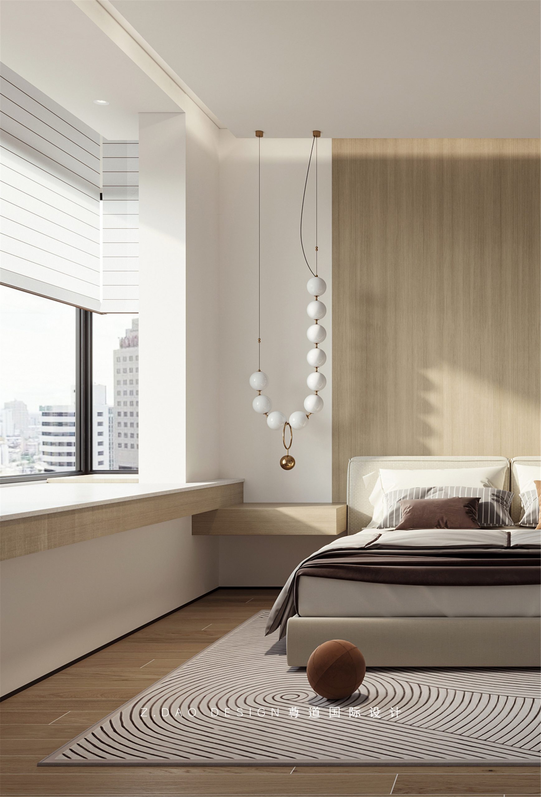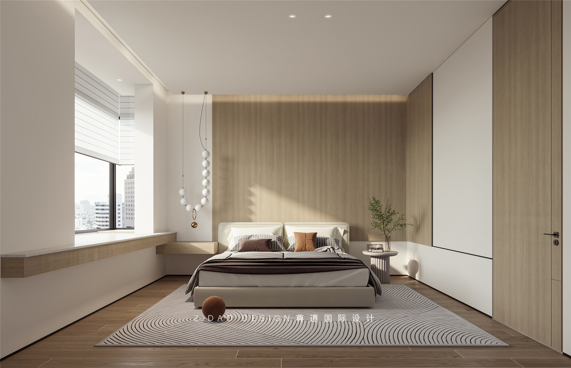 卧室延续公共空间简洁大方的设计风格,简洁朴素,没有多余的装饰,白色与木色搭配,营造出简洁自然而又舒适的睡眠空间。
