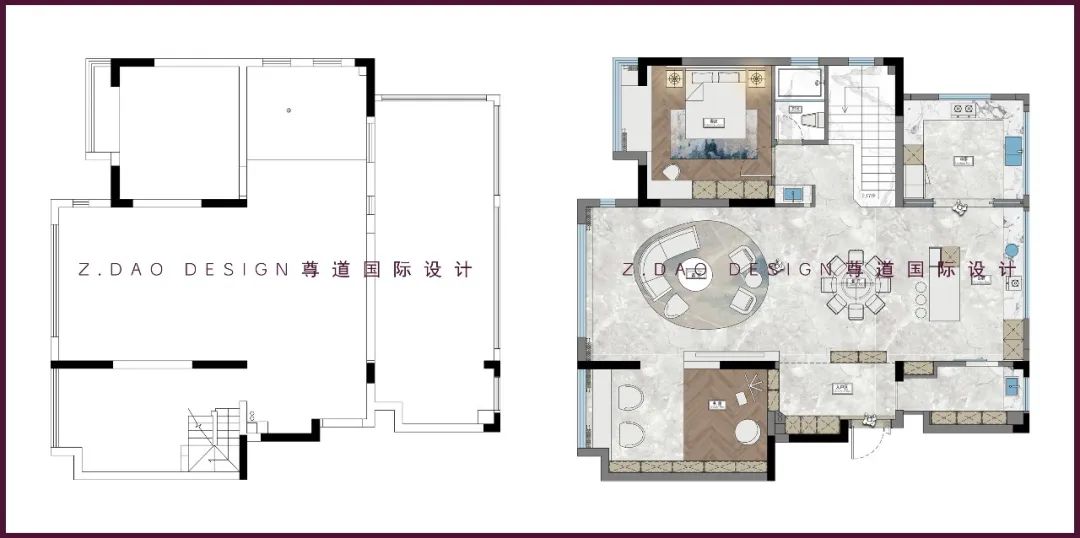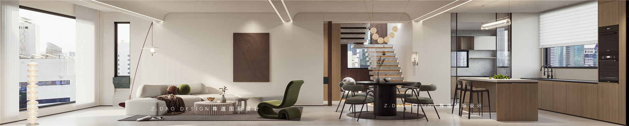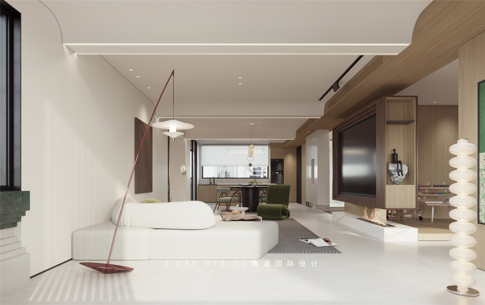 客厅、餐厅、西厨完全开放,让公共区域成为“社交型”空间,色彩上秉承着统一的温柔素雅,平衡一种微妙的和谐感。