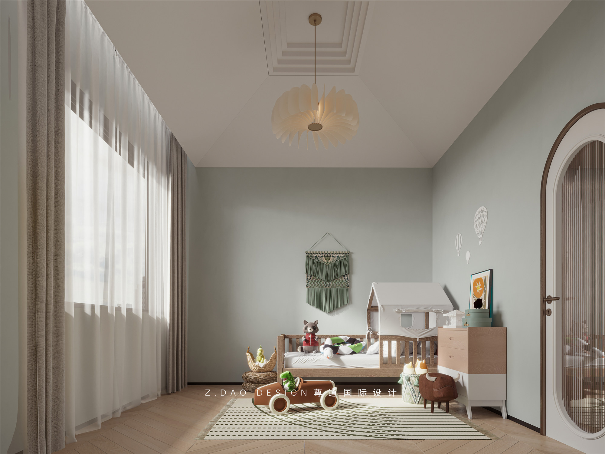 儿童房没有浓重的色彩,清浅的莫兰迪色,勾勒出柔和宁静、舒缓雅致的空间美感,似乎具有抚慰人心的治愈美感,自然光的映衬下,让人倍感安心与温柔。顶面极具造型感的吊顶为空间增添一抹亮色。